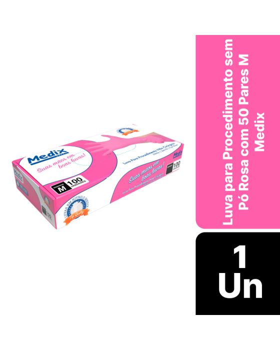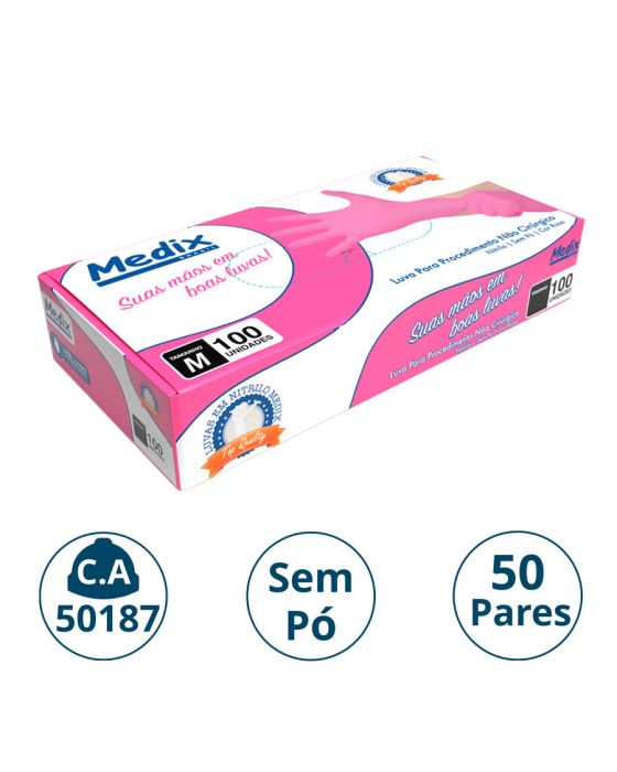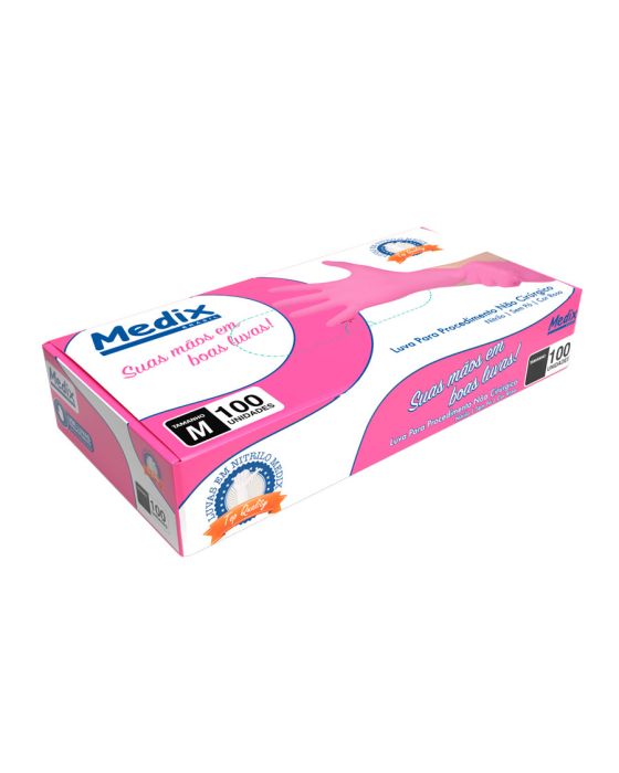 Características:A Luva Sem Pó Medix é feita em Nitrilo, projetada para segurança e proteção durante procedimentos não cirúrgicos, ambidestra e com o punho com acabamento enrolado facilitando a colocação e retirada da luva, além de ser levemente texturizada nas pontas dos dedos facilitando no toque. Esta luva é indicada para proporcionar proteção no contato com sangue, fluidos orgânicos, membranas mucosas, artigos sujos ou em outros procedimentos não invasivos.Detalhes:- Marca: Medix;- Referência: 6242;- Linha: Luvas;- Tipo: Nitrílica;- Cor: Rosa;- Tamanho: M;- C.A: 50187;- Quantidade de luvas: 100 unidades;- Quantidade de pares: 50 pares;- Contém: 1 caixa com 100 unidades;- Para: procedimento não cirúrgico;- Levemente texturizada nas pontas dos dedos;- Possui punho com acabamento enrolado;- Descartável e de uso único;- Não estéril;- Sem pó;- Ambidestra;- Proteção contra agentes biológicos.Indústria Brasileira | Validade: 5 anos após a data de fabricação.Ideal para:- Hospitais, Clínica médica, Hospitais e clínica veterinárias, Laboratórios, Estúdio de tatuagem e em qualquer ambiente que seja necessário proteção contra riscos biológicos.Modo de uso:- Verifique o tamanho adequado para suas mãos conforme indicação;- Verifique a integridade da embalagem;- Realize a higiene das mãos, assegure que as mãos estejam limpas e secas para o passo seguinte;- Retire a luva da embalagem o mais próximo possível do momento do uso;- Calce a luva cuidadosamente, sem anéis, pulseiras, relógios ou outros acessórios que possam perfurar o produto;- Após o uso, retire a luva e descarte-a imediatamente em local adequado;- Realize a higiene das mãos.Orientações:- Não reutilizar ou esterilizar após o uso;- Proibido reprocessar.Composição:- Produto confeccionado em borracha sintética (nitrilo).Medidas:- Dimensões da embalagem: 24,5 x 12,6 x 4,3cm (CxLxA);- Peso: 271g.ATENÇÃO: PROIBIDO REPROCESSAR, DESTRUIR APÓS O USO!ALÉRGICOS: ESTE PRODUTO CONTÉM BORRACHA NITRÍLICA (SINTÉTICA), SEU USO PODE CAUSAR REAÇÕES ALÉRGICAS EM PESSOAS SENSÍVEIS À BORRACHA NITRÍLICA.Em caso de reações alérgicas, procure um médico.* As especificações podem ser alteradas sem aviso prévio ** Imagem meramente ilustrativa.