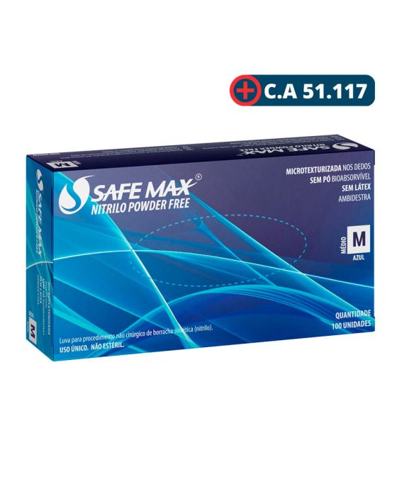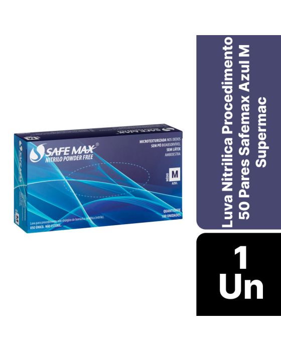Características:- Proteção, conforto e desempenho profissional: A Luva Nitrílica de Procedimento Safemax Azul M Supermax (CA 51117) é um equipamento de proteção individual (EPI) desenvolvido para oferecer segurança, resistência e conforto em procedimentos não cirúrgicos. Fabricada em borracha sintética nitrílica, é livre de látex e pó, sendo ideal para usuários com hipersensibilidade ao látex natural. Sua estrutura apresenta alta resistência à abrasão e perfurações, proporcionando durabilidade superior sem comprometer a sensibilidade tátil durante o manuseio de instrumentos e materiais delicados.- Segurança e tecnologia de fabricação: Com microtextura nas pontas dos dedos, a luva Safemax garante excelente aderência e precisão em ambientes úmidos ou secos. Seu design ambidestro, não estéril e de uso único assegura praticidade e higiene em operações de rotina. Possui Certificado de Aprovação (CA 51.117), atestando conformidade com as normas de segurança vigentes. Além disso, proporciona efetiva barreira biológica contra agentes contaminantes, embora não seja indicada como barreira química.- Aplicação e uso recomendado: Indicada para profissionais da área da saúde, laboratórios, clínicas, estética, alimentação, limpeza e indústrias, a luva nitrílica Safemax é amplamente utilizada em procedimentos gerais que exigem proteção, destreza e conforto prolongado. Seu formato ajustável facilita o calce e reduz a fadiga das mãos, mantendo a segurança e a integridade do usuário durante o trabalho.- Sobre a marca Supermax: A Supermax é uma das marcas líderes no segmento de produtos descartáveis para proteção e higiene profissional, reconhecida por sua inovação, qualidade e confiabilidade.- Dimensões da embalagem:Comprimento: 21,5cm;Largura: 11cm; Altura: 6,5cm;Peso: 349g.Atenção Proibido reprocessar, destruir após o uso!ALÉRGICOS: ESTE PRODUTO CONTÉM BORRACHA NITRÍLICA (SINTÉTICA), SEU USO PODE CAUSAR REAÇÕES ALÉRGICAS EM PESSOAS SENSÍVEIS À BORRACHA NITRÍLICA.Em caso de reações alérgicas, procure um médico.* As especificações podem ser alteradas sem aviso prévio ** Imagem meramente ilustrativa.