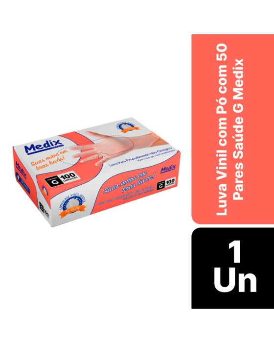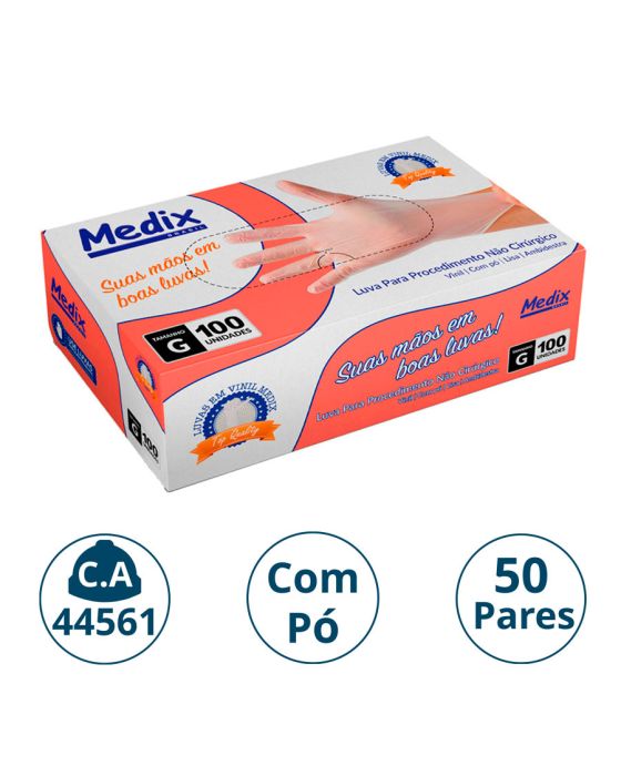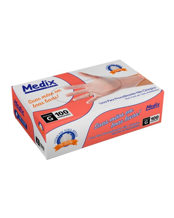 Características:A Luva com Pó Médix pé feita em vinil, projetada para segurança e proteção durante procedimentos não cirúrgicos, ambidestra e com acabamento enrolado no punho o que facilita a colocação ou retirada da luva e indicada para evitar o contato com sangue, fluidos orgânicos, membranas mucosas, artigos sujos ou em outros procedimentos não invasivos.Detalhes:- Marca: Medix;- Referência: 8614;- Linha: Luvas;- Tipo: Vinil;- Cor: Transparente;- Tamanho: G*;- C.A: 44561;- Quantidade de luvas: 100 unidades;- Quantidade de pares: 50 pares;- Contém: 1 caixa com 100 unidades;- Para: procedimento não cirúrgico;- Possui punho com acabamento enrolado;- Descartável e de uso único;- Não estéril;- Com pó bioabsorvível (amido de milho);- Ambidestra;- Proteção contra agentes biológicos.Fabricado na China. | Validade: 5 anos após a data de fabricação.Ideal para:- Hospitais, Clínica médica, Hospitais e clínica veterinários, Laboratórios, Estúdio de tatuagem e em qualquer ambiente que seja necessário proteção contra riscos biológicos.Modo de uso:- Verifique o tamanho adequado para suas mãos conforme indicação;- Verifique a integridade da embalagem;- Realize a higiene das mãos, assegure que as mãos estejam limpas e secas para o passo seguinte;- Retire a luva da embalagem o mais próximo possível do momento do uso;- Calce a luva cuidadosamente, sem anéis, pulseiras, relógios ou outros acessórios que possam perfurar o produto;- Após o uso, retire a luva e descarte-a imediatamente em local adequado;- Realize a higiene das mãos.Orientações:- Não reutilizar ou esterilizar após o uso;- Proibido reprocessar.Composição:- Produto confeccionado em borracha sintética (nitrilo).Medidas:- Dimensões da embalagem: 20 x 11,1 x 6,5cm (CxLxA);- Peso: 467g.ATENÇÃO: PROIBIDO REPROCESSAR, DESTRUIR APÓS O USO!ALÉRGICOS: ESTE PRODUTO CONTÉM BORRACHA NITRÍLICA (SINTÉTICA), SEU USO PODE CAUSAR REAÇÕES ALÉRGICAS EM PESSOAS SENSÍVEIS À BORRACHA NITRÍLICA.Em caso de reações alérgicas, procure um médico.*Os valores estão de acordo com as especificações da NBR ISO 11193-2.* As especificações podem ser alteradas sem aviso prévio ** Imagem meramente ilustrativa.