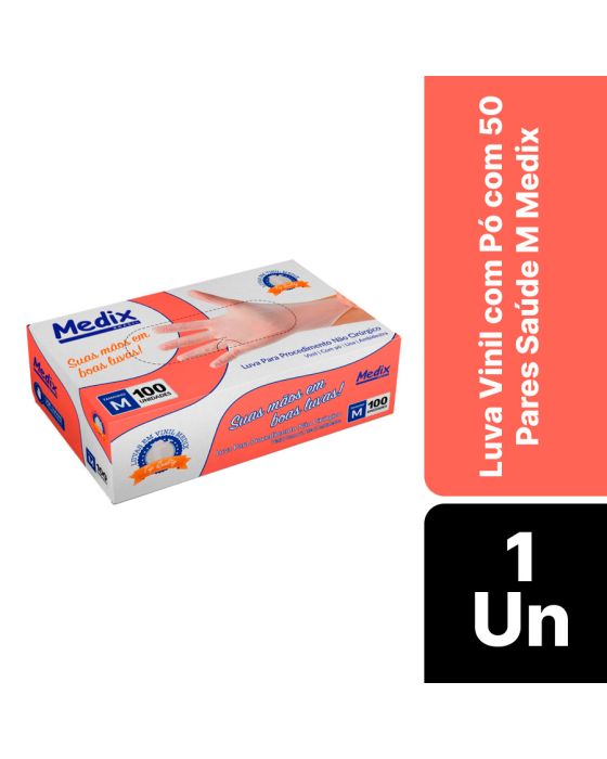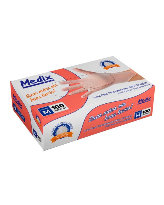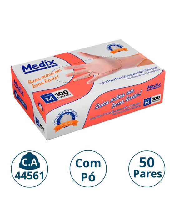 Características:A Luva com Pó Médix pé feita em vinil, projetada para segurança e proteção durante procedimentos não cirúrgicos, ambidestra e com acabamento enrolado no punho o que facilita a colocação ou retirada da luva e indicada para evitar o contato com sangue, fluidos orgânicos, membranas mucosas, artigos sujos ou em outros procedimentos não invasivos.Detalhes:- Marca: Medix;- Referência: 8626;- Linha: Luvas;- Tipo: Vinil;- Cor: Transparente;- Tamanho: M*;- C.A: 44561;- Quantidade de luvas: 100 unidades;- Quantidade de pares: 50 pares;- Contém: 1 caixa com 100 unidades;- Para: procedimento não cirúrgico;- Possui punho com acabamento enrolado;- Descartável e de uso único;- Não estéril;- Com pó bioabsorvível (amido de milho);- Ambidestra;- Proteção contra agentes biológicos.Fabricado na China. | Validade: 5 anos após a data de fabricação.Ideal para:- Hospitais, Clínica médica, Hospitais e clínica veterinários, Laboratórios, Estúdio de tatuagem e em qualquer ambiente que seja necessário proteção contra riscos biológicos.Modo de uso:- Verifique o tamanho adequado para suas mãos conforme indicação;- Verifique a integridade da embalagem;- Realize a higiene das mãos, assegure que as mãos estejam limpas e secas para o passo seguinte;- Retire a luva da embalagem o mais próximo possível do momento do uso;- Calce a luva cuidadosamente, sem anéis, pulseiras, relógios ou outros acessórios que possam perfurar o produto;- Após o uso, retire a luva e descarte-a imediatamente em local adequado;- Realize a higiene das mãos.Orientações:- Não reutilizar ou esterilizar após o uso;- Proibido reprocessar.Composição:- Produto confeccionado em borracha sintética (nitrilo).Medidas:- Dimensões da embalagem: 20 x 11,1 x 6,5cm (CxLxA);- Peso: 467g. ATENÇÃO: PROIBIDO REPROCESSAR, DESTRUIR APÓS O USO!ALÉRGICOS: ESTE PRODUTO CONTÉM BORRACHA NITRÍLICA (SINTÉTICA), SEU USO PODE CAUSAR REAÇÕES ALÉRGICAS EM PESSOAS SENSÍVEIS À BORRACHA NITRÍLICA.Em caso de reações alérgicas, procure um médico.*Os valores estão de acordo com as especificações da NBR ISO 11193-2.* As especificações podem ser alteradas sem aviso prévio ** Imagem meramente ilustrativa.