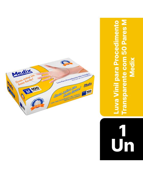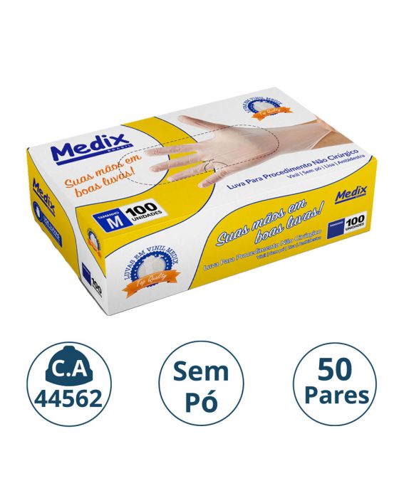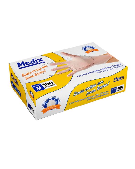 Características:A Luva Sem Pó Medix pé feita em vinil, projetada para segurança e proteção durante procedimentos não cirúrgicos, ambidestra e com acabamento enrolado no punho o que facilita a colocação ou retirada da luva e indicada para evitar o contato com sangue, fluidos orgânicos, membranas mucosas, artigos sujos ou em outros procedimentos não invasivos.Detalhes:- Marca: Medix;- Referência: 8651;- Linha: Luvas;- Tipo: Vinil;- Cor: Transparente;- Tamanho: M;- C.A: 44562;- Quantidade de luvas: 100 unidades;- Quantidade de pares: 50 pares;- Contém: 1 caixa com 100 unidades;- Para: procedimento não cirúrgico;- Espessura mínima: 0,08mm;- Possui punho com acabamento enrolado;- Descartável e de uso único;- Não estéril;- Sem pó bioabsorvível;- Ambidestra;- Superfície lisa;- Proteção contra agentes biológicos.Fabricado na China. | Validade: 5 anos após a data de fabricação.Ideal para:- Hospitais, Clínica médica, Hospitais e clínica veterinários, Laboratórios, Estúdio de tatuagem e em qualquer ambiente que seja necessário proteção contra riscos biológicos.Modo de uso:- Verifique o tamanho adequado para suas mãos conforme indicação;- Verifique a integridade da embalagem;- Realize a higiene das mãos, assegure que as mãos estejam limpas e secas para o passo seguinte;- Retire a luva da embalagem o mais próximo possível do momento do uso;- Calce a luva cuidadosamente, sem anéis, pulseiras, relógios ou outros acessórios que possam perfurar o produto;- Após o uso, retire a luva e descarte-a imediatamente em local adequado;- Realize a higiene das mãos.Orientações:- Não reutilizar ou esterilizar após o uso;- Proibido reprocessar.Composição:- Produto confeccionado em 100% vinil (Policloreto de Vinila).Medidas:- Dimensões da embalagem: 20 x 11,1 x 6,5cm (CxLxA);- Peso: 467g. ATENÇÃO: PROIBIDO REPROCESSAR, DESTRUIR APÓS O USO!ALÉRGICOS: ESTE PRODUTO CONTÉM BORRACHA NITRÍLICA (SINTÉTICA), SEU USO PODE CAUSAR REAÇÕES ALÉRGICAS EM PESSOAS SENSÍVEIS À BORRACHA NITRÍLICA.Em caso de reações alérgicas, procure um médico.* As especificações podem ser alteradas sem aviso prévio ** Imagem meramente ilustrativa.