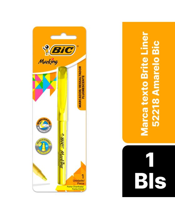 Características:- Marcador fluorescente com alta performance e versatilidade: O marca-texto BIC Brite Liner 52218 foi desenvolvido para aplicações em documentos, cadernos e impressões, oferecendo alta visibilidade e durabilidade. Sua tinta fluorescente amarela garante destaque sem comprometer a legibilidade, sendo indicada para todos os tipos de papel, inclusive papéis finos, já que não transfere para o verso da folha.- Ponta chanfrada e traço versátil: Equipado com ponta chanfrada resistente, o Brite Liner permite traçados finos e grossos (de 1,5 mm a 3,5 mm), adaptando-se à necessidade do usuário. - Ideal para vários tipos de marcação: Ideal para marcações pontuais ou sublinhados mais largos, proporciona controle preciso e conforto durante o uso, sem desgaste da ponta mesmo sob pressão prolongada.- Durabilidade e desempenho constante: A tinta do Brite Liner mantém sua intensidade mesmo com o passar do tempo, garantindo marcações sempre nítidas. Sua composição foi desenvolvida para não manchar folhas subsequentes, tornando-o uma ferramenta ideal para uso escolar, universitário e profissional.- Marca reconhecida pela confiabilidade: A BIC é referência global em soluções de escrita e marcação, combinando inovação, durabilidade e preço acessível. Dimensões do produto:Comprimento: 20,4cm;Largura: 6,6cm;Altura: 1,5cm;Peso: 165g.* As especificações podem ser alteradas sem aviso prévio ** Imagem meramente ilustrativa.