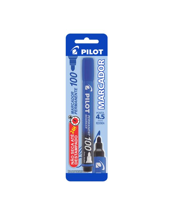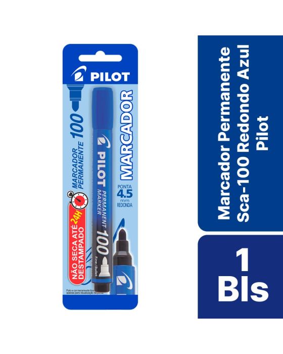 Características:O marcador Permanent Marker SCA 100 é eficiente, confortável e enfrenta qualquer desafio. Importado do Japão, conta com uma tecnologia que impede a tinta do produto de secar por até 24 horas mesmo quando destampado.Nesta versão SCA 100, o marcador é equipado com uma ponta redonda e tinta de alta qualidade. Além de possuir uma ponta super resistente, ela foi desenvolvida para evitar dispersões durante o uso, garantindo a vivacidade das cores.Além disso, sua tinta especial não desbota, formando uma película protetora que resguarda o produto contra ações climáticas, como sol e chuva. Este marcador é indicado para uso em diversas superfícies, como papéis, vidro, madeira, metal, papel cartão e plástico acrílico.Detalhes:- Marca: Pilot;- Modelo: Permanent Marker SCA 100;- Referência: 1481515;- Linha: Marcador Permanente;- Cor: Azul;- Ponta: Redonda 4,5mm;- Espessura de escrita: 1,00mm;- Contém: 1 blister com uma unidade do produto;- Livre de xileno e tolueno;- Seca instantaneamente;- Para uso profissional/artístico;- Produto não recarregável.Ideal para: - Indicado para escrever ou marcar: papel, plástico, metal, vidro, madeira, papelão e outras superfícies.Observações:- Tomar cuidado com o vestuário;- Tampar após a utilização;- Utilizar o produto em um local ventilado longe de fontes de calor e ignição.Armazenagem:- Armazenar em locais ventilados, frescos, secos e cobertos;- Mantenha a embalagem do produto fechada longe de fontes de calor ignição, crianças e alimentos;- Manter o produto na posição horizontal.Composição:- Resinas termoplásticas, fibras de poliéster, tinta à base de álcool, corantes, resinas, solventes, aditivos e ponta de acrílico.ATENÇÃO! MANTENHA FORA DO ALCANCE DAS CRIANÇAS E DOS ANIMAIS DOMÉSTICOS.* As especificações podem ser alteradas sem aviso prévio ** Imagem meramente ilustrativa.