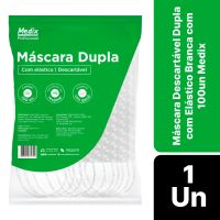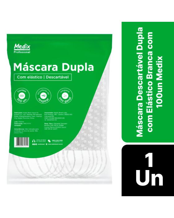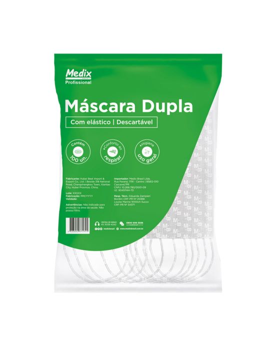 Características:A Máscara Dupla Descartável Medix é uma máscara super respirável com maior conforto ao respirar. Higiênica e destinada ao uso geral, é amplamente utilizada para proteção de uso não médico, uso industrial, alimentar, em salões de beleza, limpeza de estabelecimentos, limpeza da casa, etc.Detalhes:- Marca: Medix;- Modelo: MBLife;- Referência: 6303;- Linha: Mascaras;- Cor: Branca;- Quantidade de mascaras: 100 unidades;- Contém: 1 caixa com 100 unidades;- Mais conforto ao respirar;- Mais higiene;- Clipe nasal ajustável de aço inoxidável;- Com elástico de orelha;- Não possui látex e fibra de vidro;- Não possui filtro;- Uso geral.Fabricado na China. | Validade: 5 anos após a data de fabricação.Ideal para:- Indicado para Salões de Beleza, Barbearias, Supermercados, Academias e o dia a dia.* Não é indicado para a área da saúde por não conter filtro.Modo de uso:- Verifique a integridade da embalagem;- Realize a higiene das mãos antes de manusear a máscara;- Coloque o produto na região da face, cobrindo boca e nariz, com o lado da logomarca para fora;- Fixe a máscara utilizando os elásticos e adapte/ajuste o clipe nasal;- Após o uso, retire a máscara e descarte-a imediatamente em local adequado.Camadas de filtro:- 1ª camada: 6g (±2g);- 2ª camada: 20g (±2g).Conservação:- Proteja este produto do calor, da umidade e da luz;- Não transportar e armazenar em locais com alta umidade e temperaturas elevadas;- Manter longe de produtos químicos e corrosivos;- Manter em temperatura entre 0°C e 40°C.Orientações:- Não reutilizar ou esterilizar após o uso;- Proibido reprocessar.Composição:- Produto confeccionado em 100% polipropileno.Medidas:- Dimensões do produto: 9,5 x 17,5cm (LxA);- Dimensões da embalagem: 20 x 11,1 x 6,5cm (CxLxA);- Peso: 467g. ATENÇÃO: PROIBIDO REPROCESSAR, DESTRUIR APÓS O USO!* As especificações podem ser alteradas sem aviso prévio ** Imagem meramente ilustrativa.