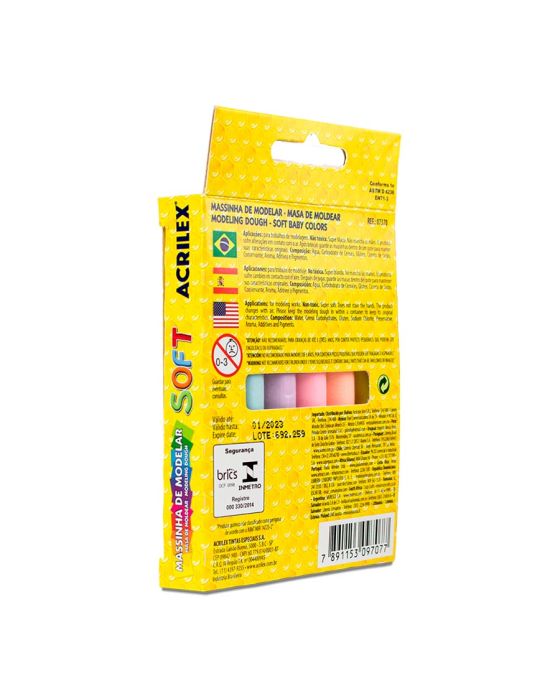 Caracteristicas: Ideal para atividades de desenvolvimento da coordenação motora e percepção de formas, também é ótima para quem gosta de usar sua criatividade artesanal!Foi desenvolvida para uso escolar ou entretenimento.Detalhes:- Marca: Acrilex.- Modelo: Baby Colors.- Referência: 07370.- Linha: Massa para modelar.- Volume/Peso: 90g.- Cores: Amarelo Bebê, Lilás Bebê, Verde Bebê, Azul Bebê, Salmão Bebê e Rosa Bebê.- Contém: 1 embalagem com 6 unidades.- À base de amido.- Super macia.- Com aroma de tutti-frutti.- Cores vivas e brilhantes.- Não tóxica.- Super macia.Esculturas:- Com a Massinha de Modelar Soft Acrilex, você pode guardar as esculturas que você quiser, é só deixar a massa secar durante 5 dias. -Após seca, pode ser pintada com Guache Acrilex. * As especificações podem ser alteradas sem aviso prévio ** Imagem meramente ilustrativa