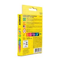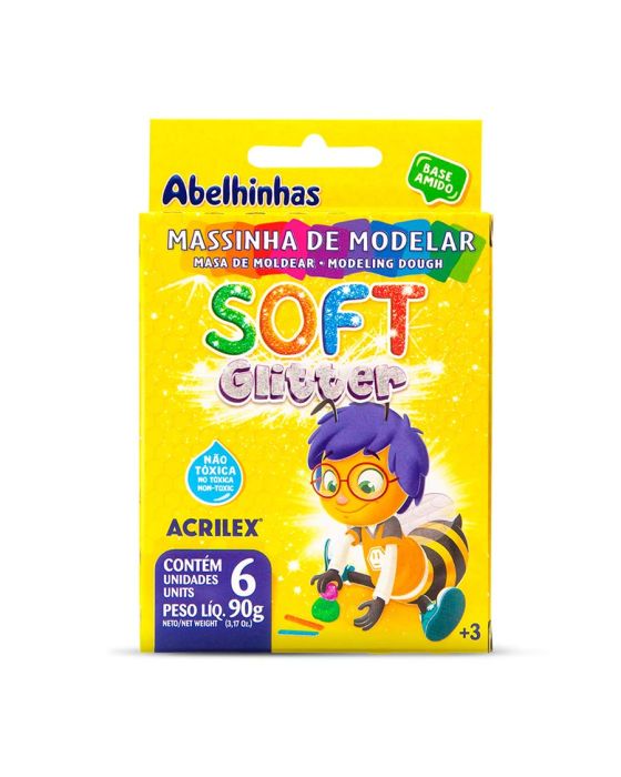 Caracteristicas:Massinha de Modelar Acrilex para você brincar de montão!Solte a imaginação brincando com as massinhas de modelar Glitter da Acrilex, são 6 cores diferentes e com glitter para dar aquele brilho para você se divertir!Detalhes: - Marca: Acrilex.- Modelo: Soft Glitter.- Referência: 7360.- Cores: 6 cores (azul, vermelho, verde, violeta, amarelo, laranja e maravilha).- Contém: 1 unidade do produto.- À base de amido.- Não tóxica.- Não mancha as mãos.- Super macia.- Com aroma de tutti-frutti.- Cores vivas e brilhantes.- Com glitter na massa.Conservação:- O produto sofre alterações em contato com o ar.- Após brincar, guarde as massinhas dentro de um pote para manter suas características orginais.Composição:- Água, Carboidratos de Cereais, Glúten, Cloreto de Sódio, Conservante, Aroma, Aditivos, Pigmentos e Glitter.* As especificações podem ser alteradas sem aviso prévio ** Imagem meramente ilustrativa.