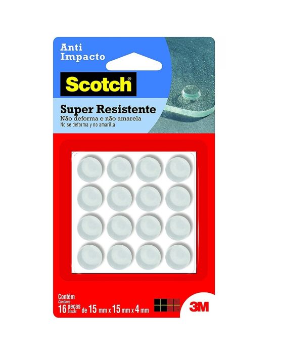 Características:O Protetor Anti-Impacto 3M Scotch™ é a solução ideal para proteger os móveis e paredes da sua casa contra batidas e riscos. Discretos e projetados para proteger seus armários, gavetas e paredes, os protetores amortecem o impacto e suavizam o som de batidas de fechamento.Com fixação rápida e forte, o Anti-Impacto 3M Scotch® pode ser encontrado em diversos formatos e tamanhos. Com alta resistência, pode ser utilizado em portas, janelas, maçanetas, tampas, gavetas, esquadrias, tampos de mesa, gabinetes de cozinha e banheiro, portas de guarda-roupas, eletrodomésticos e computadores. É à prova d’água e possui a qualidade única da 3M, que garante qualidade e ótimos resultados. Como usar: Para aplicar o Anti-Impacto 3M Scotch® as superfícies devem estar limpas, secas e livres de gorduras (ceras, óleos etc). Remova o liner protetor e aplique pressionando contra a outra superfície.Detalhes:- Marca: Scotch™;- Fabricante: 3M;- Referência: HB004263081;- Linha: Protetores Anti-Impacto;- Cor: Transparente;- Quantidade: 16 protetores- Formato: Redondo;- Tamanho: Grande;- Contém: 1 embalagem com 16 unidades do produto;- Medidas: 15 x 15 x 4mm (1,5 x 1,5 x 0,4cm));- Eles não amarelam, não deformam e protegem as superfícies e objetos contra riscos, batidas e deslizamentos;- São à prova d’água e possuem a qualidade única da 3M, que garante qualidade e ótimos resultados;- Adesivo ideal para o uso em papel;- Super Adesivo: O dobro de adesão Em relação ao regular;- Com alta resistência;- Com fixação rápida e forte.Aplicações sugeridas:- Podem ser utilizados em portas, janelas, maçanetas, tampas, gavetas, esquadrias, tampos de mesa, gabinetes de cozinha e banheiro, portas de guarda-roupas, eletrodomésticos e computadores.* As especificações podem ser alteradas sem aviso prévio ** Imagem meramente ilustrativa.