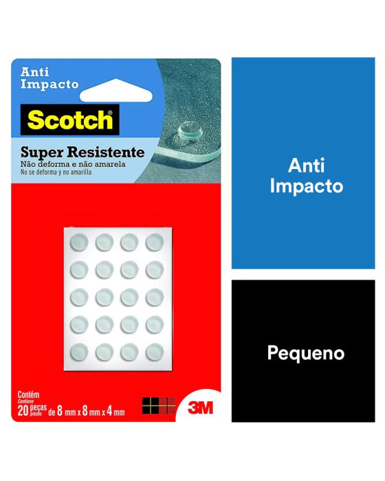 Características:O Protetor Anti-Impacto 3M Scotch™ é a solução ideal para proteger os móveis e paredes da sua casa contra batidas e riscos. Discretos e projetados para proteger seus armários, gavetas e paredes, os protetores amortecem o impacto e suavizam o som de batidas de fechamento.Com fixação rápida e forte, o Anti-Impacto 3M Scotch® pode ser encontrado em diversos formatos e tamanhos. Com alta resistência, pode ser utilizado em portas, janelas, maçanetas, tampas, gavetas, esquadrias, tampos de mesa, gabinetes de cozinha e banheiro, portas de guarda-roupas, eletrodomésticos e computadores. É à prova d’água e possui a qualidade única da 3M, que garante qualidade e ótimos resultados. Como usar: Para aplicar o Anti-Impacto 3M Scotch® as superfícies devem estar limpas, secas e livres de gorduras (ceras, óleos etc). Remova o liner protetor e aplique pressionando contra a outra superfície.Detalhes:- Marca: Scotch™;- Fabricante: 3M;- Referência: HB004263057;- Linha: Protetores Anti-Impacto;- Cor: Transparente;- Quantidade: 20 protetores;- Formato: Redondo;- Tamanho: Pequeno;- Contém: 1 embalagem com 20 unidades do produto;- Medidas: 8 x x 4mm (0,8 x 0,8 x 0,4cm));- Suaviza o barulho de fechamento de armários, portas e gavetas;- Eles não amarelam, não deformam e protegem as superfícies e objetos contra riscos, batidas e deslizamentos;- São à prova d’água e possuem a qualidade única da 3M, que garante qualidade e ótimos resultados;- Adesivo ideal para o uso em papel;- Super Adesivo: O dobro de adesão Em relação ao regular;- Com alta resistência;- Com fixação rápida e forte.Aplicações sugeridas:- Podem ser utilizados em portas, janelas, maçanetas, tampas, gavetas, esquadrias, tampos de mesa, gabinetes de cozinha e banheiro, portas de guarda-roupas, eletrodomésticos e computadores.* As especificações podem ser alteradas sem aviso prévio ** Imagem meramente ilustrativa.