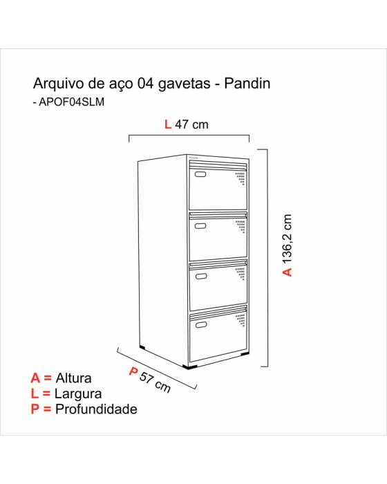 Características:Os arquivos de aço são excelentes aliados na hora de organizar a rotina. Práticos, duráveis e muito funcionais, eles facilitam as ações diárias, deixando pastas e documentos importantes organizados, protegidos e sempre a mão!Detalhes:- Marca: Pandin.- Modelo: OF04SL.- Linha: Arquivo de Aço.- Cor: Cinza.- Gavetas: 4 gavetas.- Material: Aço.- Capacidade de peso: Suporta até 25kg por gaveta.- Travamento simultâneo em todas as gavetas.Onde usar:- Escritórios: Organização de livros, pastas e documentos.Arquivo Econômico:- Tamanho da caixa: 60cm x 50cm x 1,35m.Medidas:- Largura: 47cm.- Altura: 133,5cm.- Profundidade: 57cm.Estrutura:Confeccionado em chapa de aço nº 26 (0,45mm, nas Laterais ou Corpo).Acabamento:Tratado pelo processo anti-corrosivo à base de fosfato de zinco e pintura eletrostática a pó com camada de 30 a 40 mícrons com secagem em estufa a 240 ºC (na cor cinza cristal) ou pintura em esmalte sintético com camada de 30 a 40 mícrons com secagem em estufa a 120 ºC (nas outras cores).Informações sobre o envio:- Produto enviado envolvido em um engradado de madeira.* As especificações podem ser alteradas sem aviso prévio ** Imagem meramente ilustrativa.