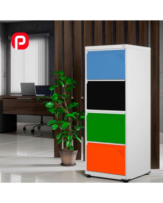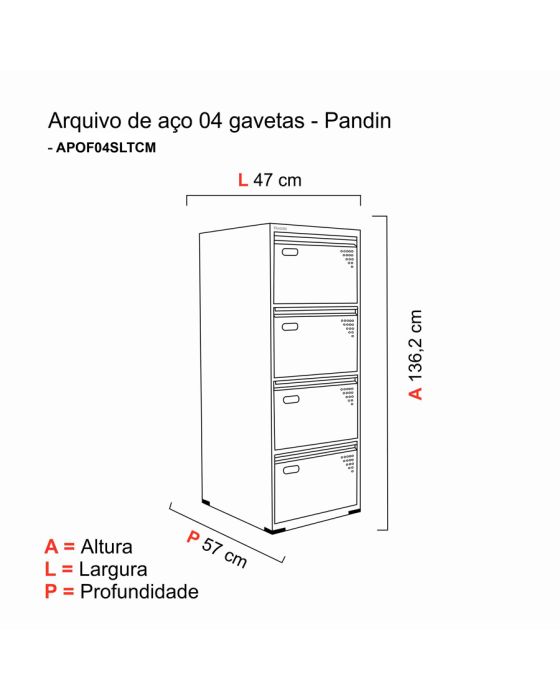Características:Os arquivos de aço são excelentes aliados na hora de organizar a rotina. Práticos, duráveis e muito funcionais, eles facilitam as ações diárias, deixando pastas e documentos importantes organizados, protegidos e sempre a mão!Detalhes:- Marca: Pandin.- Modelo: OF4SLTCM.- Linha: Arquivo de Aço.- Cor: Color (Cores mistas).- Gavetas: 4 gavetas.- Contém: 1 unidade do produto.- Material: Aço.- Capacidade de peso: Suporta até 25kg por gaveta.- Itens inclusos: Chave e Kit Pés.- Travamento simultâneo em todas as gavetas.Onde usar:- Escritórios: Organização de livros, pastas e documentos.Arquivo Econômico:- Tamanho da caixa: 60cm x 50cm x 1,35m.Medidas:- Largura: 47cm.- Altura: 136,2cm.- Profundidade: 57cm.Estrutura:- Confeccionado em chapa de aço nº 26 (0,45mm, nas Laterais ou Corpo).Acabamento:- Tratado pelo processo anti-corrosivo à base de fosfato de zinco e pintura eletrostática a pó com camada de 30 a 40 mícrons com secagem em estufa a 240 ºC (na cor cinza cristal) ou pintura em esmalte sintético com camada de 30 a 40 mícrons com secagem em estufa a 120 ºC (nas outras cores).*Produto enviado envolvido em um engradado de madeira.* As especificações podem ser alteradas sem aviso prévio ** Imagem meramente ilustrativa