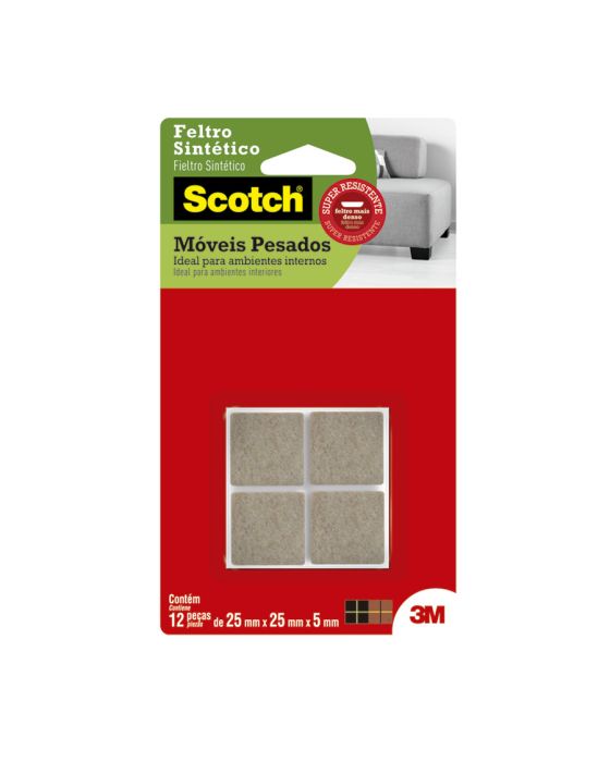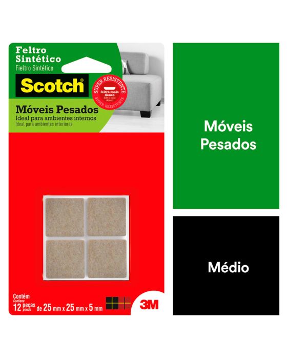 Características:O Feltro Sintético para Móveis Pesados 3M Scotch™ ajuda você a proteger a beleza do seu piso. Equipados com adesivo poderoso e feltro durável, os protetores de piso aderem sem esforço aos pés dos seus móveis e fornecem proteção duradoura contra riscos e arranhões.A linha de Feltros Sintéticos Scotch traz mais qualidade e resistência para proteger os móveis da sua casa, evitando riscos e protegendo contra batidas e deslizamentos. Com fixação rápida, prática e duradoura, eles possuem alta aderência e qualidade única da 3M™. São especialmente indicados para móveis pesados. A colagem dos Feltros Sintéticos Scotch é super forte. Ele não risca e está disponível em diversos formatos, para todos os móveis. É uma linha completa da 3M™ para proteção em sua casa ou trabalho.Detalhes:- Marca: Scotch™;- Fabricante: 3M™;- Referência: HB004262729;- Cor: Preto;- Tamanho: Grande;- Contém: 1 embalagem do produto com 12 unidades;- Antideslizante: Ajuda a estabilizar móveis e eletrodomésticos;- Não Risca: Protege e não danifica o piso;- Resistente: Durável e à prova da água;- Ambiente: Interno e externo;- Tamanho: 2,5 cm x 2,5 cm;- Alta aderência no objeto a ser colado devido a camada dupla de adesivo;- Protetor em EVA à prova d’água;- Ideal para móveis e cadeiras em ambientes com piscina ou umidade.Aplicação:- É ideal para aplicar em móveis leves, como: Cadeira, mesa e etc. para Eletrodomésticos, Mesas, Sofás e Poltronas.Modo de uso: - As superfícies devem estar limpas, secas e livres de gorduras (ceras, óleos etc);- Remover o liner protetor e aplicar pressionando contra a outra superfície.Uso:- Ideal para utilização em ambiente com água / úmidos e para evitar que os objetos se desloquem-se, evitando riscos, batidas e deslizamentos. Composição:- Liner: Papel tratado;- Dorso: EVA;- Adesivo: Adesivo Sintético.Conteúdo da embalagem: 1 Feltro Moveis Pesados Quadrado Grande 25x25mm Scotch 3m.* As especificações podem ser alteradas sem aviso prévio ** Imagem meramente ilustrativa.