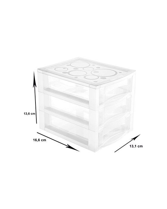 Caracteristicas:O gaveteiro facilita a organização dos seus objetos, possui transparência que facilita a visualização e trás mais praticidade para o seu dia a dia. - Medidas: 13,1 x 16,6 x 13,6 cm - Feito de Polipropileno Virgem. - Cor: Transparente / Cristal - Possui 3 Gavetas - Marca: Ordene - Referência do Fabricante: OR81200 * As especificações podem ser alteradas sem aviso prévio ** Imagem meramente ilustrativa