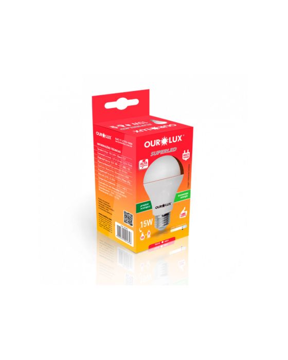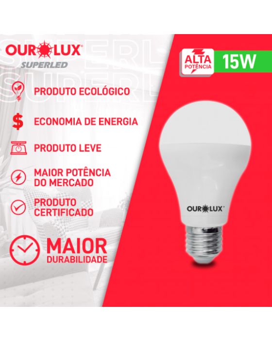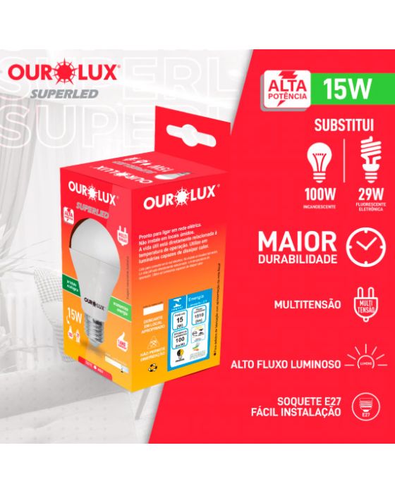CaracterísticasIdeais para ambientes amplos residenciais e comerciais, as Lâmpadas SUPERLED ALTA POTÊNCIA mantêm a elegância e minimalismo permitindo a instalação de apenas um modelo. pois possuem o melhor da tecnologia LED, alta potência e alto fluxo luminoso.Detalhes:- Marca: Ourolux.- Modelo: Superled.- Linha: Lâmpada.- Cor da lâmpada: Branca.- Temperatura de cor: 6500K- Formato do corpo: Bulbo A60.- Base de conexão: E27.- Potência (W): 15W.- Contém: embalagem com 1 unidade do produto.- Frequência: 50/60Hz.- Tensão elétrica: 100 ~ 240V.- Vida hora: 25.000.- Feixe (Graus): 200.- Eficiência (lm/W): 100.- Composição: Polímero termoplástico, metal e componentes eletrônicos.- Garantia: 01 Ano.- Tenologia LED.- Produto certificado: INMETRO.Sugestão de uso: - Utilizar em ambientes cobertos.* As especificações podem ser alteradas sem aviso prévio ** Imagem meramente ilustrativa.
