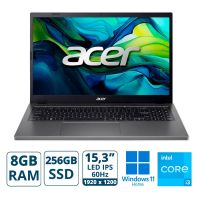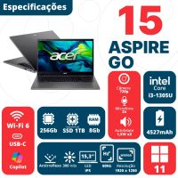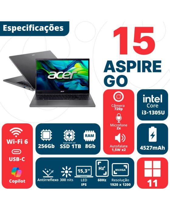 Características:- Notebook versátil com desempenho eficiente para produtividade diária: O Notebook Acer Aspire Go 15,3 foi desenvolvido para usuários que buscam desempenho equilibrado, eficiência energética e recursos modernos para atividades profissionais, acadêmicas e domésticas. Equipado com processador Intel® Core™ i3 de 13ª geração, memória DDR5 e armazenamento em SSD NVMe, entrega agilidade nas tarefas do dia a dia, navegação fluida, consumo de conteúdo e uso de aplicações corporativas com estabilidade.- Desempenho confiável com processador Intel de 13ª geração: O Aspire Go conta com o processador Intel® Core™ i3-1305U, com arquitetura híbrida de 5 núcleos (1 Performance-core e 4 Efficient-cores) e 6 threads, atingindo até 4,50 GHz. Essa configuração proporciona maior eficiência multitarefa, melhor gerenciamento de energia e resposta rápida em atividades como edição de documentos, planilhas, navegação com múltiplas abas e videoconferências. A memória RAM DDR5 de 8 GB, expansível até 32 GB, garante maior largura de banda e desempenho superior em comparação às gerações anteriores.- Tela ampla em formato 16:10 para maior área útil: A tela IPS de 15,3 polegadas com resolução WUXGA (1920 x 1200) e proporção 16:10 oferece mais espaço vertical para leitura, edição de textos e visualização de planilhas. Com brilho de 300 nits, contraste de 1200:1 e tecnologia antirreflexo Acer ComfyView™, proporciona conforto visual mesmo em ambientes iluminados, além de ângulo de visão amplo de 85°, ideal para uso prolongado.- Armazenamento rápido, conectividade moderna e autonomia equilibrada: O notebook possui SSD NVMe PCIe 4.0 de 256 GB, garantindo inicialização rápida do sistema, abertura ágil de aplicativos e maior confiabilidade no armazenamento de dados. Conta com conectividade Wi-Fi 6 (802.11ax), Bluetooth® 5.1 e suporte a redes dual band, assegurando conexões mais estáveis e eficientes. A bateria de 53 Wh (4527 mAh), composta por 3 células de íon de lítio, oferece autonomia de até 8 horas, variando conforme o perfil de uso, ideal para rotinas móveis e jornadas prolongadas fora da tomada.- Recursos inteligentes para comunicação e usabilidade: O sistema de áudio com tecnologia Acer TrueHarmony, aliado a dois alto-falantes estéreo e microfones com Acer Purified Voice 2.0, utiliza inteligência artificial para redução de ruídos em chamadas e videoconferências. O teclado em padrão ABNT 2 com teclado numérico independente, touchpad de precisão certificado pela Microsoft e teclas dedicadas AcerSense™ e Microsoft Copilot otimizam a produtividade e o controle do sistema.- Indicado para trabalho, estudos e uso doméstico: Com design compacto, leve e fabricado com materiais recicláveis, o Aspire Go é indicado para escritórios, home office, ambientes educacionais e uso doméstico. Seu conjunto de segurança com TPM em firmware e trava Kensington, aliado à fonte bivolt USB-C de 65 W, torna o equipamento uma solução confiável para quem busca mobilidade, desempenho e eficiência no dia a dia.- Sobre a marca Acer: A Acer é uma das maiores fabricantes globais de tecnologia, reconhecida pela inovação, desempenho e sustentabilidade de seus equipamentos.- Itens inclusos na embalagem: 1 Notebook Acer Aspire Go 15, 1 Fonte de alimentação do notebook, 1 Manual em português do Brasil, 1 Termo de garantia.- Garantia do fornecedor: 1 ano contra defeitos de fabricação.- Dimensões do produto: Comprimento: 34,42cm; Largura: 24,34cm; Altura: 1,99cm; Peso: 1,7kg.* As especificações podem ser alteradas sem aviso prévio ** Imagem meramente ilustrativa.