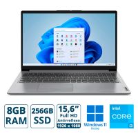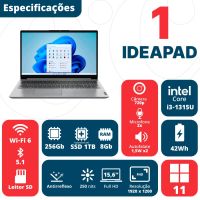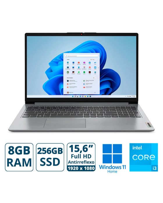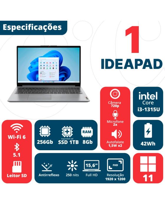 Características:- Notebook compacto e eficiente para produtividade diária e uso educacional: O Notebook Lenovo IdeaPad 1 15IRU7 foi desenvolvido para atender às demandas do dia a dia com desempenho equilibrado, portabilidade e confiabilidade. Equipado com o processador Intel® Core™ i3-1315U de 13ª geração, oferece arquitetura híbrida com núcleos de performance e eficiência, garantindo fluidez em tarefas como navegação, estudos, trabalho administrativo, consumo de conteúdo e uso de aplicativos de escritório.- Desempenho moderno com processador Intel de 13ª geração e SSD NVMe: O processador Intel® Core™ i3-1315U conta com 6 núcleos e 8 threads, alcançando até 4,5 GHz, proporcionando respostas rápidas e melhor gerenciamento de energia. O armazenamento em SSD NVMe PCIe® 4.0 de 256 GB assegura inicialização veloz do sistema, abertura rápida de programas e maior eficiência no fluxo de trabalho. A memória de 8 GB DDR4 garante estabilidade para multitarefas leves, com possibilidade de expansão até 16 GB.- Tela ampla de 15,6” com acabamento antirreflexo: A tela de 15,6” com resolução Full HD (1920 x 1080) oferece boa definição para atividades profissionais, acadêmicas e entretenimento. O acabamento antirreflexo e o brilho de 250 nits reduzem reflexos em ambientes iluminados, proporcionando maior conforto visual durante longos períodos de uso, seja em casa, no escritório ou em salas de aula.- Conectividade atualizada e recursos multimídia essenciais: O IdeaPad 1 conta com Wi-Fi 6 e Bluetooth® 5.1, garantindo conexões mais rápidas, estáveis e eficientes. Possui portas USB-A, USB-C, HDMI 1.4b, leitor de cartão SD e conector combinado para fone e microfone, permitindo fácil integração com periféricos e monitores externos. O sistema de áudio com Dolby Audio™ e a câmera HD com obturador de privacidade completam a experiência para reuniões, aulas online e chamadas de vídeo.- Autonomia adequada para a rotina diária: A bateria integrada de 42 Wh oferece autonomia compatível com a proposta do equipamento, suportando horas de uso contínuo em atividades cotidianas como navegação, edição de documentos e consumo de mídia, com carregamento por adaptador de 65 W para reposição eficiente de energia.- Indicado para estudos, trabalho remoto e uso doméstico: Versátil e leve, o Lenovo IdeaPad 1 é indicado para estudantes, profissionais administrativos, usuários domésticos e ambientes corporativos que buscam um notebook confiável para tarefas diárias. Seu design compacto facilita o transporte, enquanto o sistema operacional Windows 11 Home oferece uma interface moderna, segura e produtiva.- Sobre a marca Lenovo: A Lenovo é uma das líderes globais em tecnologia, reconhecida pela qualidade, inovação e confiabilidade de seus notebooks, desktops e soluções corporativas.- Itens inclusos na embalagem: 1 Notebook Lenovo Ideapad 1 15IRU7, 1 Fonte de alimentação do notebook 65W, 1 Manual em português do Brasil.- Garantia do fornecedor: 1 ano contra defeitos de fabricação.- Dimensões do produto: Comprimento: 36,02cm; Largura: 23,cm; Altura: 1,79cm; Peso: 1,62kg.* As especificações podem ser alteradas sem aviso prévio ** Imagem meramente ilustrativa.