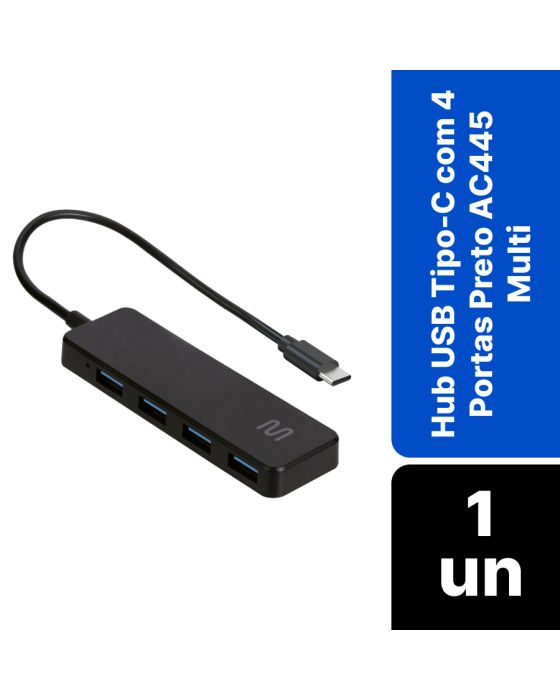 Características:Com o Hub USB Tipo-C com 4 portas Multi você transforma uma única porta USB Tipo-C em seu computador em 4 portas! Não deixe de usar seus acessórios por falta de conexões.Detalhes:- Marca: Multi;- Modelo: Hubs USB Tipo-C;- Referência: AC445;- Linha: Hubs;- Cor: Preto;- Quantidade de portas: 4 portas;- Contém: 1 unidade do produto;- Conexão USB Tipo-C;- 4 Portas USB-A;- Velocidade de Transmissão 5Gb/s.Geral:- Interface: USB Tipo-C;- Conector: USB tipo-A;- Entradas: 4x USB tipo-A;- Velocidade Máxima de Transmissão de Dados: 5 Gb/s;- Compatibilidade: Windows, MacOS e Linux;- Dispositivos: Mouse, teclado, headset, pen drive.Composição: - Fabricado em plástico ABS e componentes eletrônicos.Medidas:- Dimensões da embalagem: 14,5 x 7,8 x 1,7cm (CxLxA);- Peso: 35g.Conteúdo da embalagem: 1 Hub USB Tipo-C Multi.Garantia do fornecedor: 3 anos contra defeitos de fabricação.*As especificações podem ser alteradas sem aviso prévio ** Imagem meramente ilustrativa.