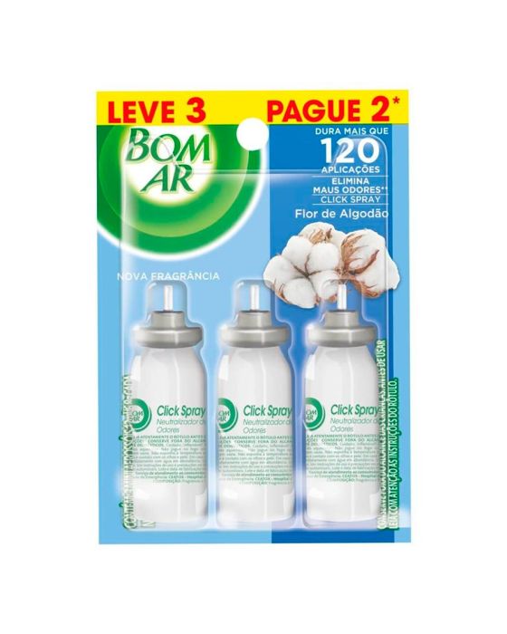 Caracteristicas:O Bom Ar Click Spray é um discreto aparelho plástico com miniaerossol que se fixa facilmente nas superfícies. Com apenas um click você obtém perfumação duradoura de maneira simples e rápida. Graças a sua fórmula, Bom Ar Click Spray libera um suave perfume, que deixa os ambientes com um agradável frescor.Detalhes:- Marca: Bom Air- Modelo: Refil Click Spray- Contém: 3 unidades promocionais de refil com 12ml cada.- Fragrância: Flor de Algodão- Embalagem promocional leve 3 pague 2- Dura mais que 120 aplicaçõesOnde usar:- BanheiroModo de usar:- Levante a tampa plástica do seu aparelho BomAr Click Spray, retire o tubo vazio. - Insira o tubo até ouvir o clique do encaixe. Feche a Tampa- Vaporize: para perfumar, aperte no local indicado. Um clique é suficiente para uma perfumação duradoura. - Lave as mãos após a utilização do produto.- Para retirar o aparelho não puxe, gire-o.- Composição:- Fragrância e PropelentesConservação:- Mantenha hrmeticamente fechado em um lugar ventilado.- Não expor ao sol.- Armazenarem local seco e arejado.- Não expor a umidade ou água.- NÃO ARMAZENAR EM BANHEIROS, EMBAIXO DE PIAS, TANQUES.CONSERVE FORA DO ALCANCE DE CRIANÇAS E DOS ANIMAIS DOMÉSTICOS!!* As especificações podem ser alteradas sem aviso prévio ** Imagem meramente ilustrativa.