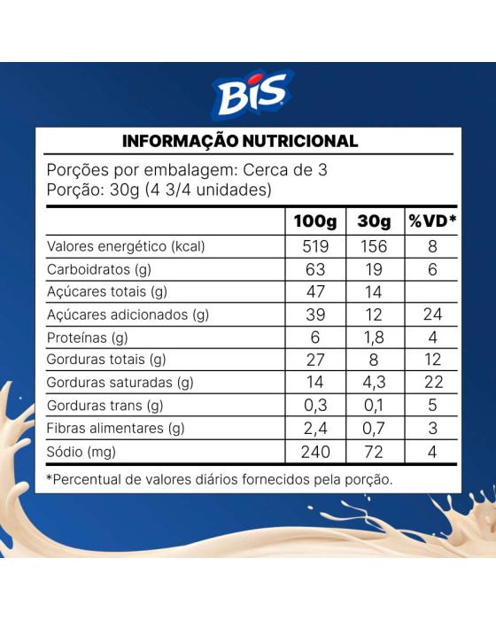 Características:- Crocância e cremosidade em perfeita harmonia: O Chocolate Bis Branco Laka 100,8g Lacta combina a tradicional leveza e crocância do wafer Bis com a suavidade e cremosidade do chocolate branco Laka, criando uma experiência única e irresistível a cada mordida. Sua formulação equilibrada garante textura crocante e sabor marcante, com o dulçor característico do chocolate branco, que se destaca pela pureza e delicadeza do leite em sua composição.- Composição e qualidade: Cada embalagem contém 16 unidades individuais de Bis Branco, embaladas para preservar a textura e o frescor do produto. Produzido com chocolate branco de alta qualidade, o Bis Laka oferece uma sensação cremosa e envolvente, mantendo o padrão de excelência Lacta, referência em chocolates no Brasil.- Aplicações e formas de consumo: Perfeito para momentos de descontração, reuniões, festas, lanches rápidos ou sobremesas criativas, o Bis Branco Laka é versátil e ideal para compartilhar. Pode ser consumido puro, utilizado em decoração de bolos e sobremesas, ou incorporado em receitas que pedem um toque crocante e saboroso.- Sobre a marca Lacta: A Lacta, marca referência em chocolates no Brasil desde 1912, é sinônimo de qualidade, tradição e inovação. Ingredientes: Açúcar, gordura vegetal, farinha de trigo enriquecida com ferro, ácido fólico, vitaminas B1, B2, B3 e zinco, soro de leite em pó, cacau em pó, permeado de soro de leite em pó, leite em pó integral, farinha de soja, amendoim, gordura de manteiga desidratada, extrato de malte, sal, flocos de arroz, massa de cacau, óleo vegetal, manteiga den cacau, emulsificantes: lecitina de soja e poliglicerol polirricinoleato, fermento químico: bicarbonato de sódio e aromatizante.- Informação nutricional e alergênicos:Contém glúten. Contém lactose.Alérgicos: Contém amendoim, derivados de leite, soja, trigo e cevada. Pode conter amêndoa, castanha-de-caju, avelã, centeio, aveia e látex natural. - Dimensões da embalagem: Comprimento: 14,7cm; Largura: 5,6cm; Altura: 2,5cm; Peso: 108g.* As especificações podem ser alteradas sem aviso prévio ** Imagem meramente ilustrativa.