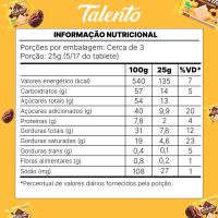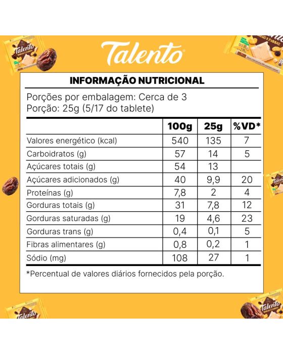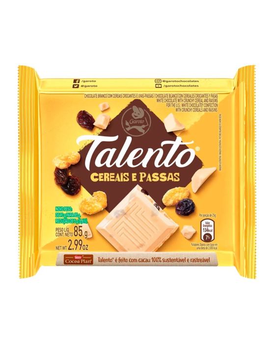 Características:- Combinação nutritiva com nova fórmula: O Chocolate Branco Talento Cereais e Passas traz uma mistura equilibrada entre a cremosidade do chocolate branco da Garoto, a leve crocância dos cereais e o dulçor natural das passas. - Nova Fórmula: A nova fórmula proporciona uma textura mais suave e um sabor harmonioso, unindo prazer e nutrição em um só produto.- Feito com cacau sustentável: Produzido com cacau 100% sustentável, por meio do programa CocoaPlan, que assegura práticas responsáveis em toda a cadeia de produção.- Versatilidade no consumo: Ideal para consumo direto em momentos de pausa, lazer, lanches ou como alternativa de presente. A barra de 85g oferece porções generosas em uma embalagem prática, perfeita para levar no dia a dia.- Qualidade da marca Talento / Garoto: Fabricado pela linha Talento, da Garoto, marca tradicional no mercado brasileiro, reconhecida por sua excelência em chocolates e compromisso com sustentabilidade.- Ingredientes: Açúcar, leite em pó, manteiga de cacau, cereais (farinha de milho enriquecida com ferro e ácido fólico, farinha de trigo integral, açúcar, aveia em flocos, coco ralado, cacau em pó, corante beta-caroteno sintético e aromatizante), gordura vegetal, uva passa, emulsificantes lecitina de soja, poliglicerol polirricinoleato e aromatizante.- Informação nutricional e alergênicos:Contém glúten. Contém Lactose.Alérgicos: contém aveia e derivados de leite , de cevada e de soja. Pode conter Amendoim, Amêndoa, Castanha-de-Caju, Castanha-do-pará, Avelã, Centeio, Cevada, Trigo e Látex Natural.- Dimensões do produto:Comprimento: 9,3cm;Largura: 9cm;Altura: 1,1cm;Peso: 85g.* As especificações podem ser alteradas sem aviso prévio ** Imagem meramente ilustrativa.