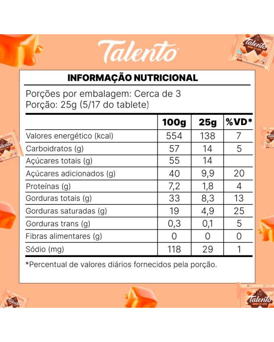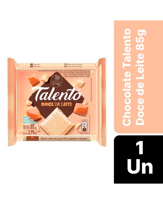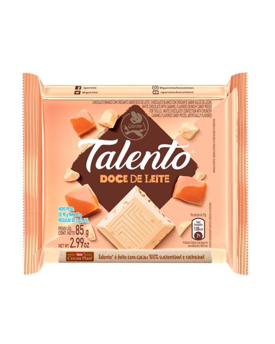 Características:- Combinação cremosa com nova fórmula: O Chocolate Branco Talento com Doce de Leite une a suavidade do chocolate branco da Garoto com o sabor marcante e tradicional do doce de leite, criando uma combinação rica e indulgente. - Nova Fórmula: A nova fórmula entrega mais cremosidade e equilíbrio entre dulçor e textura, tornando cada pedaço uma experiência intensamente saborosa.- Feito com cacau sustentável: Produzido com cacau 100% sustentável, por meio do programa CocoaPlan, que assegura práticas responsáveis em toda a cadeia de produção.- Versatilidade no consumo: Ideal para consumo direto em momentos de pausa, lazer, lanches ou como alternativa de presente. A barra de 85g oferece porções generosas em uma embalagem prática, perfeita para levar no dia a dia.- Qualidade da marca Talento / Garoto: Fabricado pela linha Talento, da Garoto, marca tradicional no mercado brasileiro, reconhecida por sua excelência em chocolates e compromisso com sustentabilidade.- Ingredientes: Açúcar, leite em pó, manteiga de cacau, crocante sabor doce de leite (açúcar, xarope de glicose, gordura vegetal, leite em pó, manteiga, sal, emulsificantes mono e diglicerídeos de ácidos graxos e lectina de soja e aromatizante), gordura vegetal, emulsificantes lecitina de soja, poliglicerol polirricinoleato e aromatizante.- Informação nutricional e alergênicos:Contém glúten. Contém Lactose.Alérgicos: contém derivados de leite e de soja. Pode conter Amendoim, Amêndoa, Castanha-de-Caju, Castanha-do-pará, Avelã, Aveia, Centeio, Cevada, Trigo e Látex Natural.- Dimensões do produto:Comprimento: 9,3cm;Largura: 9cm;Altura: 1,1cm;Peso: 85g.* As especificações podem ser alteradas sem aviso prévio ** Imagem meramente ilustrativa.