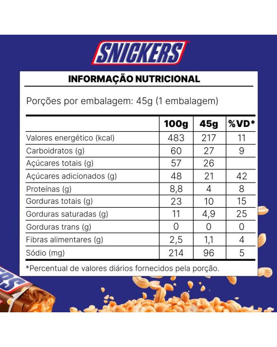 - Uso e Aplicação: Indicado para consumo imediato em ambientes domésticos, corporativos ou comerciais. Excelente opção para lanches rápidos, consumo energético entre refeições ou comercialização em pontos de venda.- Sabor e Composição: Barra clássica com recheio de nougat, caramelo e amendoim torrado, coberta com chocolate ao leite. Proporciona sabor marcante, textura crocante e sensação prolongada de saciedade.- Estrutura e Embalagem: Produto individual com 45g, embalado em material selado que preserva o sabor, a crocância e as propriedades dos ingredientes.- Composição e Ingredientes: Açúcar, amendoim, xarope de glicose, leite em pó, manteiga de cacau, gordura vegetal, massa de cacau, lactose, permeado de soro de leite, gordura láctea, sal, clara de ovo em pó, emulsificantes (lecitina de soja, sais de amônio do ácido fosfatídico e poliglicerol polirricinoleato) e aromatizante.Dimensões e peso da embalagem:Comprimento: 10,5cm;Largura: 3cm;Altura: 2cm;Peso: 45g.- ALÉRGICOS: Contém amendoim e derivados de leite, soja e ovo. Pode conter trigo, centeio, cevada, aveia e látex natural.Contém lactose. Contém glúten.* As especificações podem ser alteradas sem aviso prévio ** Imagem meramente ilustrativa.