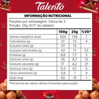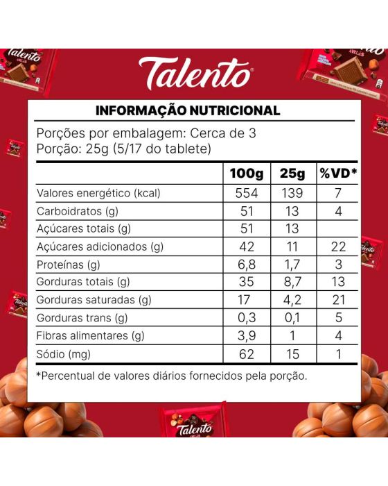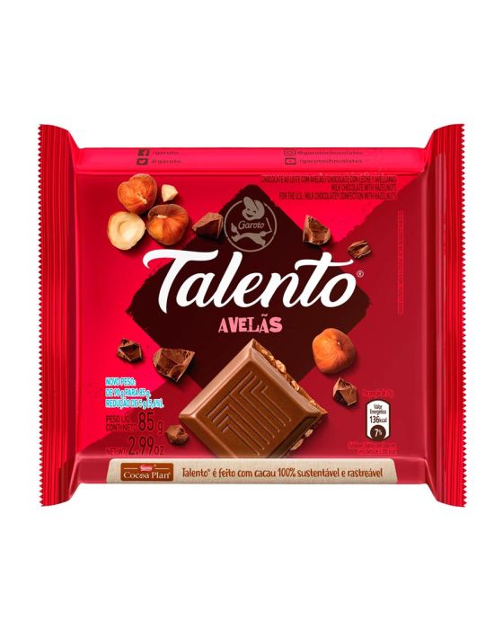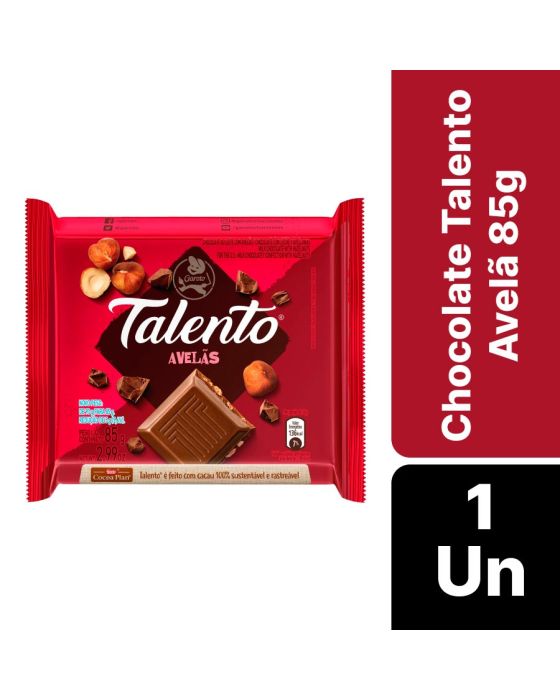 Características:- Combinação premium com nova fórmula: O Chocolate Talento Avelãs traz o clássico chocolate ao leite da Garoto enriquecido com pedacinhos de avelã distribuídos por todo o tablete. - Nova fórmula: A nova fórmula oferece maior cremosidade e realce do sabor da avelã, proporcionando uma experiência intensa e sofisticada a cada pedaço.- Feito com cacau sustentável: Produzido com cacau 100% sustentável, por meio do programa CocoaPlan, que assegura práticas responsáveis em toda a cadeia de produção.- Versatilidade no consumo: Ideal para consumo direto em momentos de pausa, lazer, lanches ou como alternativa de presente. A barra de 85g oferece porções generosas em uma embalagem prática, perfeita para levar no dia a dia.- Qualidade da marca Talento / Garoto: Fabricado pela linha Talento, da Garoto, marca tradicional no mercado brasileiro, reconhecida por sua excelência em chocolates e compromisso com sustentabilidade..- Ingredientes: Açúcar, leite em pó, massa de cacau, avelã, manteiga de cacau, amêndoas, uvas passas, gordura vegetal, permeado de soro de leite em pó, gordura anidra de leite, emulsificantes lecitina de soja, poliglicerol polirricinoleato e aromatizante.- Informação nutricional e alergênicos:Contém glúten. Contém Lactose.Alérgicos: contém avelã e derivados de leite e de soja. Pode conter Amendoim, Amêndoa, Castanha-de-Caju, Castanha-do-pará, Avelã, Aveia, Cevada, Centeio, Trigo e Látex Natural.- Dimensões do produto:Comprimento: 9,3cm;Largura: 9cm;Altura: 1,1cm;Peso: 85g.* As especificações podem ser alteradas sem aviso prévio ** Imagem meramente ilustrativa.