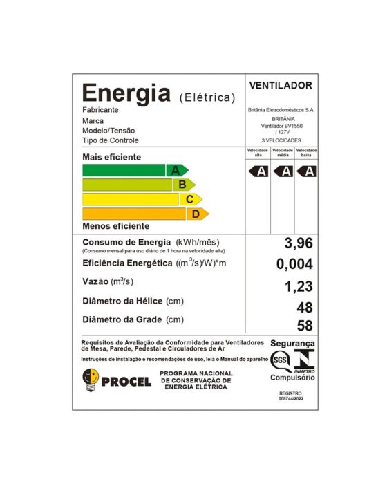 Características:Com 175W de potência, o Ventilador de Coluna Britânia BVT550 entrega maior poder de ventilação para dizer adeus aos dias quentes! Desenvolvido com tecnologia Maxx Force, inclui Hélice de 6 pás com 48cm com altíssimo desempenho.Seu design com grade de 58cm garante mais praticidade! É fácil de montar, desmontar e limpar, além de ser equipado com 3 opções de velocidades, suave, moderada e intensa que se adéquam à sua necessidade. A grande flexibilidade do sistema de articulação permite ajustar as 3 opções de oscilação vertical e oscilação horizontal automática.Superseguro, o motor foi desenvolvido com sistema de que interrompe o funcionamento do produto quando há superaquecimento e sistema de travamento de grades, além disso, no quesito silencio, ele desempenha com excelente força de vento e com mínimo de ruído.Os dias de verão não serão mais os mesmos, o Ventilador de Coluna Britânia Turbo Silencioso 175W BVT550 irá agradar e refrescar esses momentos! Detalhes:- Marca: Britânia;- Modelo: Maxx Force;- Referência: BVT550;- Linha: Ventiladores;- Cor: Preto;- Tensão: 127V;- Potência: 175W;- Tipo de instalação: Coluna;- Contém: 1 unidade do produto;- Número de velocidades: 3 velocidades (suave, moderada e intenso);- Quantidade de pás: 6 pás;- Hélice com diâmetro de 48cm;- Grade com diâmetro de 58cm;- Grade Plástica frontal removível;- Inclinação vertical;- Oscilação horizontal automática;- Baixo nível de ruído;- Super Silencioso;- Grade turbo;- Motor com fusível térmico.Energia:- Tensão: 127V;- Potência: 175W;- Vazão: 1,23 m3/s;- Eficiência Energética (m3/s)W)*m: 0,004;- Consumo de energia (kWh/mês): 3,89;- Classificação energética: Velocidade Alta: A / Velocidade Média: A / Velocidade Baixa: A.Medidas:- Dimensões do produto: 45,5 x 57 x 167cm (CxLxA);- Dimensões da embalagem: 58 x 17 x 80,5cm (CxLxA);- Peso do produto: 7,653kg;- Peso da embalagem: 8,685kg.Conteúdo da embalagem: 1 ventilador Britânia Maxx Force BVT550 e 1 manual de instruções.Garantia do fornecedor: 1 ano contra defeitos de fabricação.