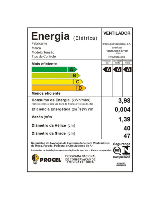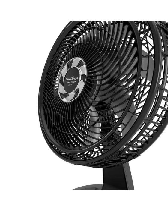 Características:O Ventilador Britânia 2 em 1 Maxx Force Silencioso 174W BVT481 é ideal para dias com mais frescor! São 174W de potência, 47 cm, 8 pás e a incrível tecnologia Maxx Force, que juntos ampliam a vazão e distribuem o ar de maneira extremamente uniforme no seu ambienteMuito versátil e com grande flexibilidade, o BVT481 possui novo sistema de articulação sem borboleta que permite ajustar entre 3 opções de inclinação vertical e um botão que aciona a oscilação horizontal automática. Além disso, ele é superseguro e conta com grade turbo e sistema de travamento entre a grade frontal e traseira, o que mantém a segurança e evita o contato com a hélice. A base, muito bem projetada, é 2 em 1! Oferece ampla estabilidade ao produto e pode ser usado na mesa, sobre alguma bancada ou como ventilador de parede.Potente e moderno, conte com a excelência do Ventilador Britânia 2 em 1 Maxx Force Silencioso 174W BVT481!Detalhes:- Marca: Britânia;- Modelo: Maxx Force Silencioso;- Referência: BVT481;- Linha: Ventiladores;- Cor: Preto;- Tensão: 220V;- Potência: 174W;- Tipo de instalação: De mesa;- Contém: 1 unidade do produto;- Número de velocidades: 3 velocidades (mínimo, média e máxima);- Quantidade de pás: 8 pás;- Versátil: pode ser utilizado na mesa ou na parede.- Super silencioso;- 2 em 1.Diferenciais:- Grade Turbo: Garante maior vazão de ar e excelente desempenho;- Grade que obedece às normas de segurança (contato com partes móveis);- Grade removível: fácil de montar, desmontar e limpar;- Oscilação horizontal automática com novo sistema de acionamento (botão integrado à carcaça);- 3 opções de oscilações vertical;- Novo sistema de articulação para ajuste da inclinação vertical (sem borboleta);- Alça para transportar e Porta-fio;- Novo sistema de travamento entre grade frontal e traseira;- Alça na grade traseira para transportar o aparelho.Energia:- Tensão: 220V;- Potência: 174W;- Consumo de energia: 3,98 Kwh/mês.Medidas:- Dimensões do produto: 37 x 48 x 67cm (CxLxA);- Dimensões da embalagem: 18,7 x 49,5 x 58,7cm (CxLxA);- Peso do produto: 3,443kg;- Peso da embalagem: 3,964kg.Conteúdo da embalagem: 1 ventilador e 1 manual de instruções.Garantia do fornecedor: 1 ano contra defeitos de fabricação.* As especificações podem ser alteradas sem aviso prévio ** Imagem meramente ilustrativa.