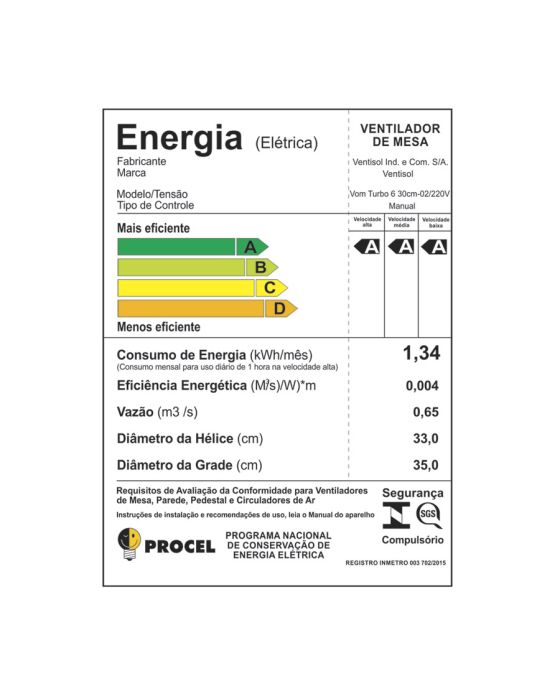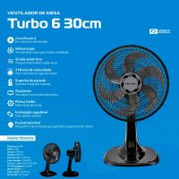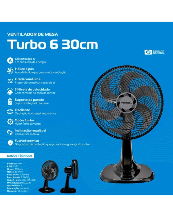 Características:- Desempenho superior para ambientes mais frescos: O Ventilador de Mesa Ventisol Turbo Premium 6P foi desenvolvido para garantir potência e eficiência no dia a dia. Com motor turbo de alta performance e hélice aerodinâmica de 6 pás, oferece maior vazão de ar com baixo nível de ruído, proporcionando um ambiente mais agradável e confortável para trabalho, lazer ou descanso.- Tecnologia e eficiência energética: Classificado com selo A pelo INMETRO, o modelo assegura economia no consumo de energia sem abrir mão da performance. Seu consumo mensal é de apenas 1,34kWh, sendo uma escolha inteligente e econômica para uso contínuo.- Design funcional e moderno: A estrutura conta com grade Wind-line, que melhora a distribuição do fluxo de ar, e base redesenhada para maior estabilidade e estilo. Além disso, o ventilador pode ser utilizado em mesa, piso ou parede, graças ao suporte de fixação integrado, oferecendo versatilidade para diferentes ambientes.- Ajustes personalizados para maior conforto: Com oscilação horizontal automática e inclinação vertical regulável, o usuário tem liberdade para direcionar o fluxo de ar conforme a necessidade. A grade de 35 cm e a hélice de 33 cm ampliam a área de ventilação, garantindo melhor circulação de ar em espaços médios.- Qualidade Ventisol: A Ventisol é uma marca brasileira reconhecida pela fabricação de equipamentos de ventilação e climatização que unem desempenho, segurança e custo-benefício. Seus produtos são projetados para atender tanto ao uso residencial quanto corporativo, com foco em inovação e durabilidade.- Especificações Técnicas:Voltagem: 220V.Potência: 52W.Vazão: 0,67m³/s.Consumo de energia: 1,34kWh/mês.Hélice: 6 pás, 33 cm.Grade: 35 cm.- Garantia do fornecedor: 1 ano contra defeitos de fabricação.- Dimensões do produto:Comprimento: 35cm;Largura: 32,5cm;Altura: 57cm;Peso: 1,6kg.- Dimensões da embalagem:Comprimento: 36cm;Largura: 17,5cm;Altura: 36cm;Peso: 1,95kg.* As especificações podem ser alteradas sem aviso prévio ** Imagem meramente ilustrativa.