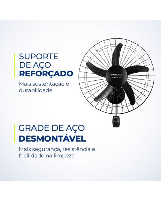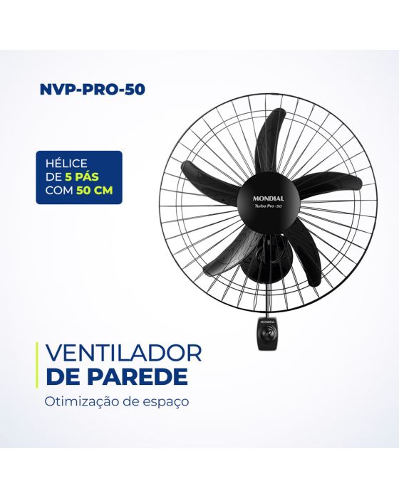Características:O Ventilador de Parede Turbo Pro NVP-PRO-50 possui 50 cm de diâmetro e um design aerodinâmico de alta performance, que garante um ambiente sempre fresquinho, mesmo nos dias de calor intenso. O motor Turbo Pro de 150W, aliado a hélice de 5 pás, gera mais intensidade do vento e maior vazão do ar.Detalhes:- Marca: Mondial;- Modelo: Turbo;- Referência: NVP-PRO-50;- Linha: Ventiladores;- Cor: Preto;- Tensão: 127V;- Tipo de instalação: Parede;- Uso: Somente uso interno;- Contém: 1 unidade do produto;- Número de velocidades: 3 velocidades (mínimo, média e máxima);- Quantidade de pás: 5 pás;- Hélice com diâmetro de 50cm;- Grade frontal removível;- Inclinação vertical regulável;- Controle de velocidade para fixar na parede;- Mais silêncio e conforto;- Ambiente ventilado e espaço otimizado.Diferenciais:- Ventilador de 50cm + Hélice com 5 Pás: O design aerodinâmico e de alta performance do NVP-PRO-50 proporciona maior intensidade do vento e melhor distribuição de ar. O resultado é um ambiente mais fresco e arejado!- Otimização do Espaço + Suporte de Aço Reforçado: O ventilador de parede permite maior otimização do espaço. Além disso, o suporte que prende o aparelho à parede é de aço reforçado, garantindo maior sustentação e durabilidade;- Potência: 150W: Garante vento mais forte e com maior vazão do ar;- Grades de Aço Desmontável: A grade frontal de aço desmontável oferece mais segurança, resistência e facilidade na limpeza das hélices, o que simplifica a lavagem e a remoção de poeira, e garante melhor qualidade do ar; - Cntrole de Velocidade: As 3 opções de velocidade permitem adequar o vento à sua necessidade: Máxima Turbo, Média Conforto e Mínima Brisa;- Maior Distribuição de Ar: O Sistema Oscilante Contínuo amplia o raio de alcance do vento no ambiente, permitindo uma distribuição de ar mais eficiente nos cômodos da casa.- Inclinação Vertical Regulável: Para um direcionamento ideal do fluxo do ar.Energia:- Tensão: 127V;- Potência: 150W.Medidas:- Dimensões do produto montado: 50 x 50 x 50cm (CxLxA);- Dimensões da embalagem: 51,3 x 22,3 x 52,3cm (CxLxA);- Peso: 2,2kg.Conteúdo da embalagem: 1 ventilador de Parede Turbo NVP-PRO-50 Britânia e 1 manual de instruções.Garantia do fornecedor: 1 ano contra defeitos de fabricação.* As especificações podem ser alteradas sem aviso prévio ** Imagem meramente ilustrativa.