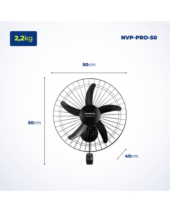 Características:O Ventilador de Parede Turbo Pro NVP-PRO-50 possui 50 cm de diâmetro e um design aerodinâmico de alta performance, que garante um ambiente sempre fresquinho, mesmo nos dias de calor intenso. O motor Turbo Pro de 150W, aliado a hélice de 5 pás, gera mais intensidade do vento e maior vazão do ar.Detalhes:- Marca: Mondial;- Modelo: Turbo;- Referência: NVP-PRO-50;- Linha: Ventiladores;- Cor: Preto;- Tensão: 220V;- Tipo de instalação: Parede;- Uso: Somente uso interno;- Contém: 1 unidade do produto;- Número de velocidades: 3 velocidades (mínimo, média e máxima);- Quantidade de pás: 5 pás;- Hélice com diâmetro de 50cm;- Grade frontal removível;- Inclinação vertical regulável;- Controle de velocidade para fixar na parede;- Mais silêncio e conforto;- Ambiente ventilado e espaço otimizado.Diferenciais:- Ventilador de 50cm + Hélice com 5 Pás: O design aerodinâmico e de alta performance do NVP-PRO-50 proporciona maior intensidade do vento e melhor distribuição de ar. O resultado é um ambiente mais fresco e arejado!- Otimização do Espaço + Suporte de Aço Reforçado: O ventilador de parede permite maior otimização do espaço. Além disso, o suporte que prende o aparelho à parede é de aço reforçado, garantindo maior sustentação e durabilidade;- Potência: 150W: Garante vento mais forte e com maior vazão do ar;- Grades de Aço Desmontável: A grade frontal de aço desmontável oferece mais segurança, resistência e facilidade na limpeza das hélices, o que simplifica a lavagem e a remoção de poeira, e garante melhor qualidade do ar; - Cntrole de Velocidade: As 3 opções de velocidade permitem adequar o vento à sua necessidade: Máxima Turbo, Média Conforto e Mínima Brisa;- Maior Distribuição de Ar: O Sistema Oscilante Contínuo amplia o raio de alcance do vento no ambiente, permitindo uma distribuição de ar mais eficiente nos cômodos da casa.- Inclinação Vertical Regulável: Para um direcionamento ideal do fluxo do ar.Energia:- Tensão: 220V;- Potência: 150W.Medidas:- Dimensões do produto montado: 50 x 50 x 50cm (CxLxA);- Dimensões da embalagem: 51,3 x 22,3 x 52,3cm (CxLxA);- Peso: 2,2kg.Conteúdo da embalagem: 1 ventilador de Parede Turbo NVP-PRO-50 Britânia e 1 manual de instruções.Garantia do fornecedor: 1 ano contra defeitos de fabricação.* As especificações podem ser alteradas sem aviso prévio ** Imagem meramente ilustrativa.
