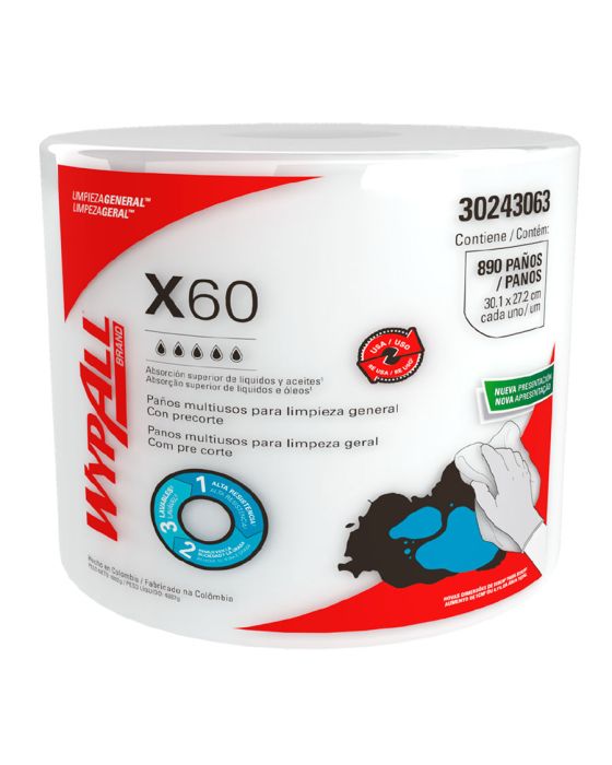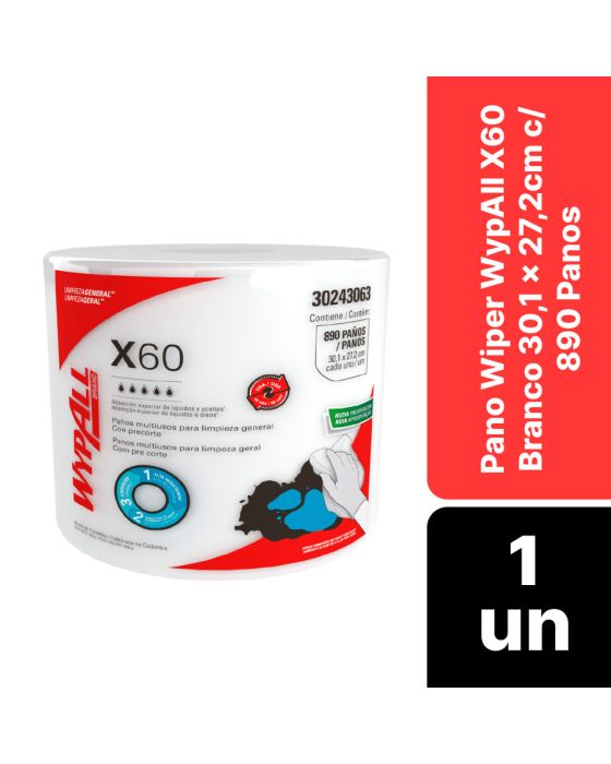 Características:O pano de limpeza descartável WypAll® X60 Jumbo, é a solução ideal para quem busca praticidade! Versátil e com alta capacidade de absorção, o X60 é indicado para limpeza de superfícies em geral, absorção de líquidos e óleos.Possui uma alta capacidade e velocidade de absorção de líquidos, e uma alta resistência por sua tecnologia HYDROKNIT.A tecnologia Hydroknit combina o poder de absorção da celulose e a resistência do polipropileno, sendo a ferramenta ideal para atuar nas tarefas mais simples, até as mais difíceis.Mais que um pano de limpeza, WypAll® é uma marca com selo de qualidade Kimberly-Clark Professional™. Uma ferramenta confiável sempre.Detalhes:- Marca: WypAll;- Modelo: X60;- Linha: Panos Descartáveis;- Tipo: Rolo Jumbo;- Cor: Branco;- Quantidade de panos por rolo: 890 panos;- Contém: 1 unidade do produto;- Tamanho: 30,1 x 27,2cm cada;- Alta resistência;- Lavável;- Tecnologia HYDROKNIT;- Panos reutilizáveis para limpeza pesada de graxas e óleos;- Com pré-corte;- Absorção máxima de líquidos e óleos;- Limpeza pesada.Ideal para:- Indicado para uso em espaços onde é exigido o máximo de higiene como industrias alimentícias, frigorífico, Food Service (Cozinhas profissionais), supermercados, hospitais - Healthcare (área da saúde), remove óleo e graxa etc.Composição:- Fibras de Celulose e Polipropileno.Medidas:- Dimensões do produto: 31,3 x 31,3 x 27,2cm (CxLxA);- Peso: 5,26Kg.* As especificações podem ser alteradas sem aviso prévio ** Imagem meramente ilustrativa.