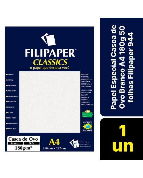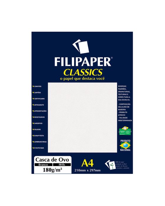 Características:- Acabamento texturizado e alta performance para impressões profissionais: O Papel Especial Filipaper Casca de Ovo 50 folhas é uma solução premium para projetos gráficos, impressões criativas e comunicações visuais que exigem sofisticação e durabilidade. Com textura diferenciada que simula a superfície da casca de ovo ampliada, esse papel oferece excelente definição visual e toque refinado, valorizando qualquer tipo de aplicação.- Qualidade técnica e alta compatibilidade: Com gramatura de 180g/m², é indicado para impressões que demandam resistência térmica e secagem rápida. Proporciona menor consumo de tinta e ótima performance em diversos processos de impressão como off-set, tipografia, serigrafia, hot-stamping, silk screen, relevo seco e americano. Também aceita acabamentos como corte e vinco, laminação e personalizações de alto nível.- Sustentabilidade e composição nobre: Fabricado com 100% de fibras de eucalipto provenientes de florestas plantadas, o papel possui composição alcalina, sendo ambientalmente responsável e ideal para uso em documentos duráveis. Trata-se de um produto nacional com garantia de qualidade e compromisso ecológico.- Indicação de uso: Ideal para convites, cartões, certificados, cardápios, folders, receituários, apresentações, lembrancinhas, scrap festas, artesanatos e aplicações gráficas que exijam papel com personalidade e acabamento especial. É compatível com impressoras que aceitam papéis de alta gramatura.- Fabricante: A Filipaper é referência nacional em papéis especiais, com foco em inovação, sustentabilidade e desempenho técnico.- Dimensões da embalagem:Comprimento: 30cm;Largura: 21,3cm;Altura: 1,3cm;Peso: 589g.* As especificações podem ser alteradas sem aviso prévio ** Imagem meramente ilustrativa.