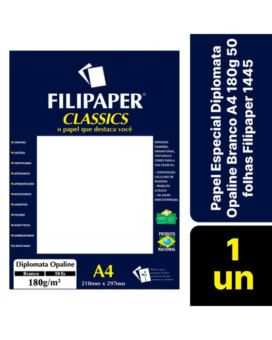 Características:- Pacote com 50 folhas – superfície alisada e rigidez ideal para impressões com acabamento profissional:O Papel Especial Filipaper Diplomata Opaline Branco é indicado para projetos gráficos que exigem qualidade visual, durabilidade e alto desempenho em impressão. Com superfície bem alisada e acabamento uniforme, este papel tipo cartão oferece excelente rigidez e é ideal para aplicações que demandam definição precisa e aparência sofisticada.- Desempenho técnico e durabilidade: Com gramatura de 180g/m², o Opaline apresenta estrutura encorpada e estável, favorecendo cortes precisos, dobras limpas e impressões nítidas. É livre de ácido e possui pH neutro, o que assegura maior durabilidade e resistência ao envelhecimento do material. Sua superfície lisa é especialmente indicada para impressões offset e digitais de alta qualidade.- Sustentabilidade e composição nobre: Fabricado com celulose proveniente de florestas renováveis, o Papel Pérsico é uma opção ecologicamente correta, ideal para aplicações profissionais e criativas. O produto é 100% nacional e alia desempenho técnico à responsabilidade ambiental.- Aplicações ideais: Recomendado para convites, certificados, cartões, folders, cardápios, receituários, apresentações corporativas, lembranças, scrap festas e projetos artesanais. Sua rigidez e acabamento proporcionam excelente performance em personalizações que exigem impacto visual e sofisticação.- Fabricante: A Filipaper é reconhecida no mercado brasileiro por sua linha de papéis especiais voltados para o segmento gráfico, criativo e institucional.- Dimensões do produto:Comprimento: 30,4cm;Largura: 21,3cm;Altura: 1,3cm;Peso: 575g.* As especificações podem ser alteradas sem aviso prévio ** Imagem meramente ilustrativa.
