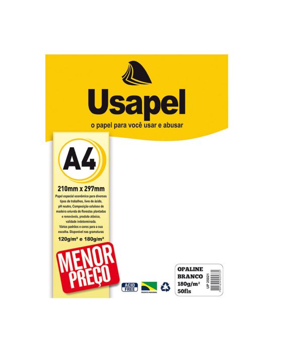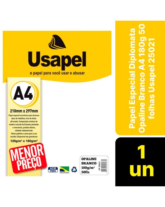 Características:- Pacote com 50 folhas – acabamento liso com excelente alvura e rigidez para impressões profissionais: O Papel Especial Usapel Diplomata Opaline Branco é a escolha ideal para quem busca elegância, versatilidade e alta performance gráfica. Com superfície lisa, ótima alvura e espessura uniforme, proporciona excelente definição de impressão e acabamento refinado em materiais institucionais e criativos.- Desempenho técnico e durabilidade: Com gramatura de 180g/m², o cartão Opaline oferece rigidez, estrutura firme e resistência a altas temperaturas, garantindo estabilidade dimensional em diversos processos gráficos. Sua composição alcalina, com pH neutro, assegura durabilidade e preservação das características físicas ao longo do tempo. É compatível com técnicas como off-set, tipografia, serigrafia, hot-stamping, relevo seco e americano, e aceita bem laminação, corte e vinco. Além disso, proporciona secagem rápida e menor consumo de tinta, otimizando a produção gráfica.- Sustentabilidade e composição nobre: Produzido com 100% de fibras de eucalipto provenientes de florestas plantadas e renováveis, o papel Diplomata Opaline Usapel é um produto ambientalmente responsável. Seu processo de fabricação é voltado à eficiência e sustentabilidade, mantendo alto padrão técnico e ecológico. Produto 100% nacional.- Aplicações ideais: Recomendado para convites, certificados, cartões, folders, cardápios, receituários, apresentações corporativas, lembranças, scrap festas e projetos artesanais. Sua excelente alvura e acabamento uniforme valorizam impressos com alto nível de detalhamento e acabamento sofisticado.Fabricante: A Usapel é uma empresa reconhecida no mercado brasileiro por oferecer papéis especiais com excelente padrão de qualidade, acabamento técnico e sustentabilidade.- Dimensões do produto:Comprimento: 30cm;Largura: 21cm;Altura: 1,3cm;Peso: 575g.* As especificações podem ser alteradas sem aviso prévio ** Imagem meramente ilustrativa.