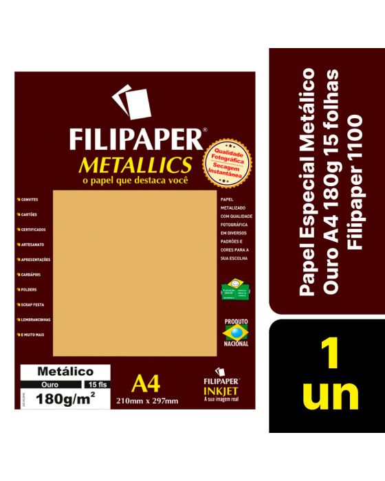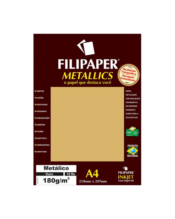 Características:- Pacote com 15 folhas – acabamento metalizado dourado com brilho sofisticado e qualidade fotográfica: O Papel Especial Filipaper Metálico Ouro é a escolha ideal para projetos gráficos que exigem requinte, impacto visual e acabamento premium. Com brilho elegante e uniforme, seu revestimento exclusivo com pigmentos metalizados oferece efeito dourado marcante, ideal para destacar peças personalizadas e produções de alto padrão.- Desempenho técnico e durabilidade: Com gramatura de 180g/m², o papel proporciona estrutura firme, excelente planicidade e boa performance em cortes, dobras e processos de acabamento. Sua formulação especial inkjet receptiva permite impressão de alta definição em impressoras jato de tinta, garantindo cores nítidas sobre o fundo metálico. O revestimento não compromete a secagem da tinta e mantém a qualidade fotográfica nas aplicações. É ideal para trabalhos gráficos que requerem elegância e resistência.- Sustentabilidade e composição nobre: Produzido com celulose de florestas plantadas e renováveis, o papel metálico da Filipaper alia desempenho técnico e responsabilidade ambiental. Sua composição alcalina, livre de ácido, garante maior longevidade ao impresso, evitando amarelamento ou degradação ao longo do tempo. Produto 100% nacional, com fabricação comprometida com práticas sustentáveis.- Aplicações ideais: Recomendado para convites, certificados, cartões, folders, cardápios, receituários, apresentações corporativas, lembranças, scrap festas e projetos artesanais. A tonalidade ouro confere prestígio, sendo ideal para ocasiões que exigem diferenciação estética.- Fabricante: A Filipaper é reconhecida no mercado brasileiro por sua linha de papéis especiais voltados para o segmento gráfico, criativo e institucional.- Dimensões do produto:Comprimento: 30cm;Largura: 20cm;Altura: 1,3cm;Peso: 200g.* As especificações podem ser alteradas sem aviso prévio ** Imagem meramente ilustrativa.