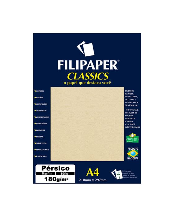 Características:- Pacote com 50 folhas – textura refinada inspirada nas nuances do pêlo de cavalo: O Papel Especial Filipaper Pérsico Marfim é indicado para projetos gráficos e artesanais que exigem sofisticação, textura marcante e alto padrão visual. Com gravação em ambos os lados, sua superfície simula com fidelidade as nuances do pêlo de cavalo, resultando em um acabamento único, elegante e perceptível ao toque.- Acabamento técnico e composição nobre: Com gramatura de 180g/m², o papel é firme, encorpado e oferece excelente desempenho em aplicações que envolvem impressão e acabamento gráfico. Livre de ácido, possui pH neutro, o que garante maior longevidade aos impressos e segurança na conservação de documentos. É fabricado com celulose proveniente de florestas plantadas e renováveis, reforçando o compromisso com a sustentabilidade.- Desempenho e compatibilidade: O papel Pérsico é compatível com impressões que não dependem de superfícies totalmente lisas, sendo amplamente utilizado em processos como off-set, tipografia, relevo seco, relevo americano, hot-stamping e corte e vinco. Sua secagem é rápida e sua estrutura proporciona bom rendimento de tinta com excelente definição.- Aplicações ideais: Recomendado para convites, certificados, cartões, folders, cardápios, receituários, apresentações corporativas, lembranças, scrap festas e projetos artesanais. Seu aspecto marfim texturizado agrega valor visual, sendo uma escolha certeira para quem busca impacto e requinte na apresentação de materiais.- Fabricante: A Filipaper é reconhecida no mercado brasileiro por sua linha de papéis especiais voltados para o segmento gráfico, criativo e institucional. - Dimensões do produto:Comprimento: 30cm;Largura: 21,3cm;Altura: 1,4cm;Peso: 572g.* As especificações podem ser alteradas sem aviso prévio ** Imagem meramente ilustrativa.