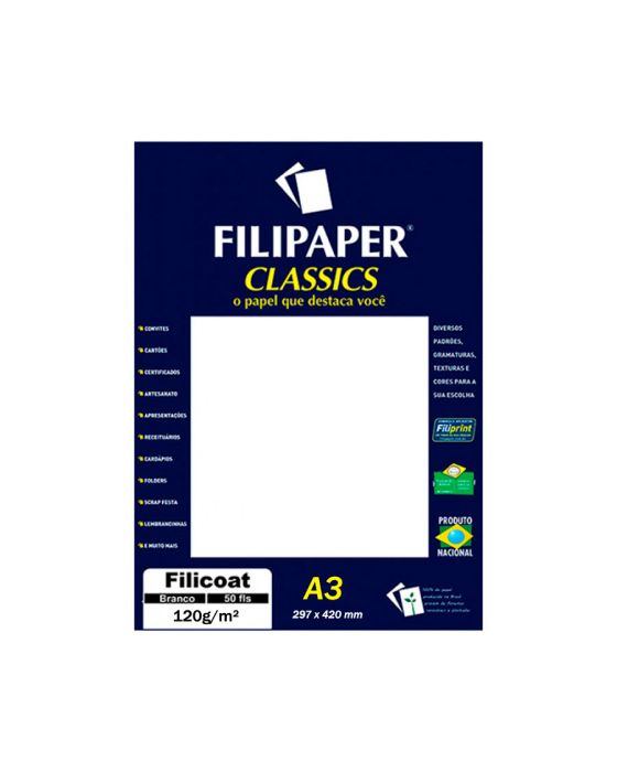 Características:- Impressão digital com qualidade fotográfica frente e verso: O Papel FiliCoat A3 120g da Filipaper é desenvolvido para impressões coloridas de alta definição, com acabamento técnico e visual refinado. Sua formulação com revestimento especial proporciona excelente aderência do toner e estabilidade térmica, sendo compatível com impressoras digitais a laser e cera. A embalagem contém 125 folhas, atendendo com eficiência projetos gráficos e corporativos de médio a grande volume.- Alto desempenho e definição em impressões profissionais: Com gramatura de 120 g/m², o papel possui rigidez ideal para impressos de apresentação com excelente manuseio e durabilidade. A superfície tratada garante impressões nítidas, com brilho controlado, fidelidade de cores e secagem rápida. Permite impressão frente e verso com opacidade adequada, evitando transparências e preservando o acabamento visual.- Aplicações versáteis para uso gráfico e institucional: Indicado para layouts, folders, cartazes, apostilas, relatórios empresariais, cartões de visita, apresentações, convites, certificados, receituários, cardápios, scrap festa e projetos personalizados. O formato A3 (297 x 420 mm) oferece maior área útil, ideal para impressos de maior impacto visual e peças promocionais em larga escala.- Estabilidade térmica e compatibilidade técnica: Desenvolvido para suportar as altas temperaturas dos processos de impressão a laser e cera, o FiliCoat evita ondulações, manchas e soltura de toner. Sua estrutura dimensional estável assegura resultados consistentes em equipamentos gráficos profissionais.- Fabricante: A Filipaper é reconhecida no mercado brasileiro por sua linha de papéis especiais voltados para o segmento gráfico, criativo e institucional.- Dimensões do produto:Comprimento: 42,8cm;Largura: 30,2cm;Altura: 1,9cm;Peso: 581g.* As especificações podem ser alteradas sem aviso prévio ** Imagem meramente ilustrativa.