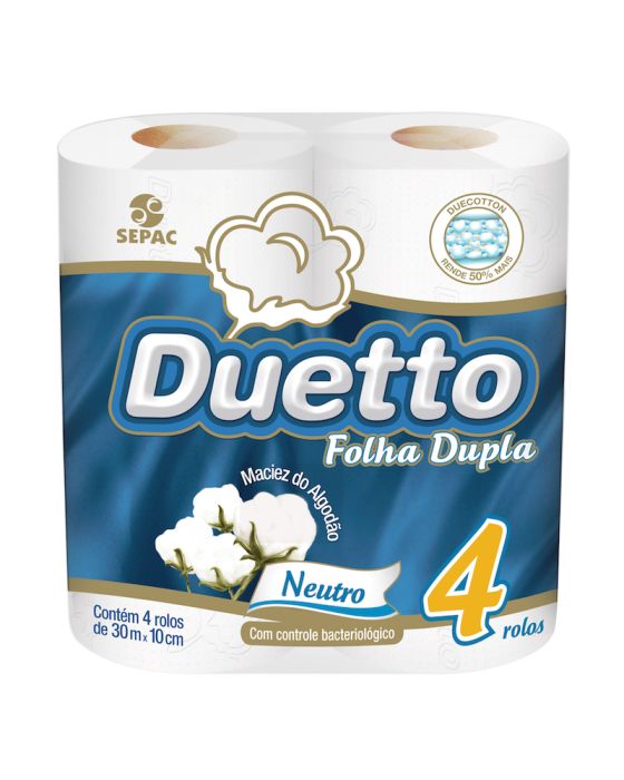 Caracteristicas:Posicionando-se no mercado como um papel higiênico folha dupla de qualidade e brancura superior, mas a um preço convidativo, o Duetto é reconhecido por sua maciez, resistência e incrível suavidade.Tudo isso se deve à qualidade de suas matérias-primas, à gofragem especial do seu papel e à inovadora tecnologia Duecotton: folha dupla aliada à maciez do algodão, tornando-o muito mais suave para a pele. - Embalagem com 4 rolos - 30m x 10cm - Folha Dupla - Neutro - Gramatura: 28 a 32 g/m² * As especificações podem ser alteradas sem aviso prévio ** Imagem meramente ilustrativa