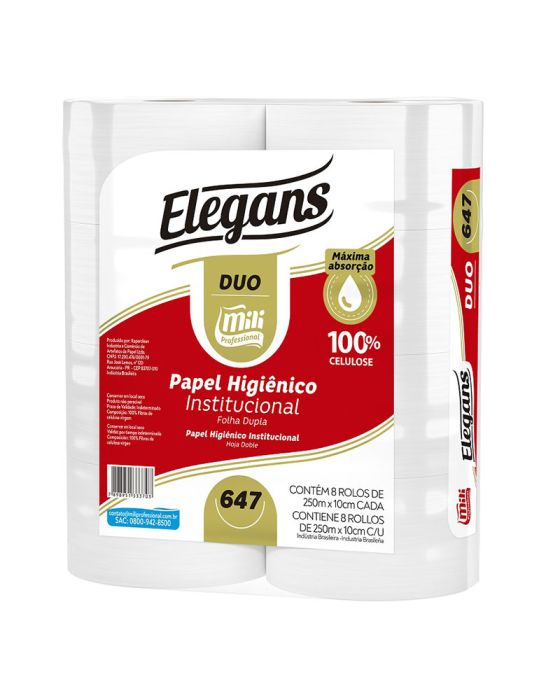 Caracteristicas:Papel higiênico institucional rolão branco. Papel resistente e de alta absorção. - Folha Dupla - 100% celulose - Linha: Soft Duo - Medida: 250m x 10 cm - Extremamente macio - Contém 8 rolos por caixa - Espessura: 14gr + 14gr - Marca: Mili Professional - Cód Fornecedor: 149Armazenamento na embalagem original.Não armazenar em ambientes com umidade e que contenham odores provenientes deprodutos de limpeza.Siga as instruções contidas na caixa sobre empilhamento máximo.A embalagem pode e deve ser reciclada. * As especificações podem ser alteradas sem aviso prévio ** Imagem meramente ilustrativa