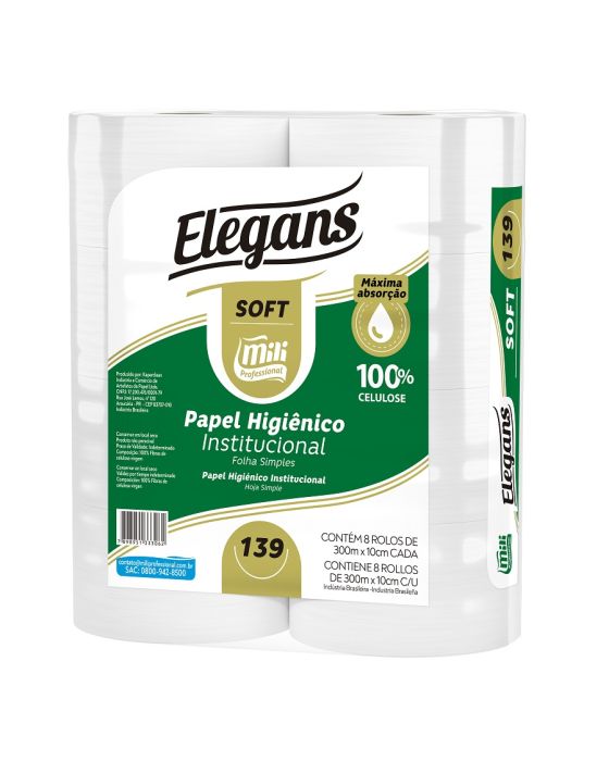 Características: - Papel higiênico de folha simples - Total de 8 rolos com 300 metros - Marca: Mili Professional - Folha simples - Gramatura: 20 Gramas - Branco luxo (ou premium) - superior ao branco - 10 cm x 300 metros - 18g 100% fibras de celulose virgem - Código 139 Mili * Imagens meramente Ilustrativas