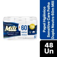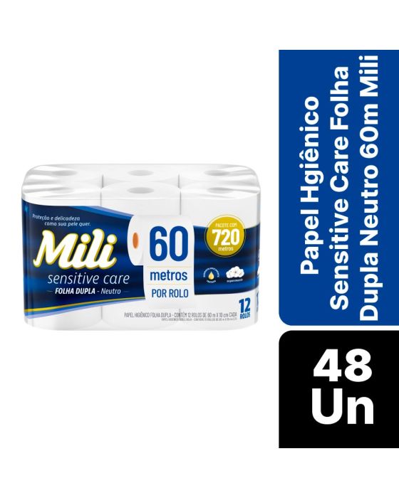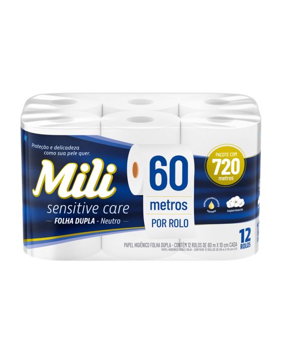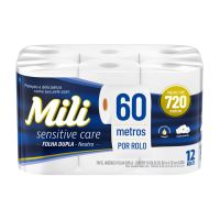 Características:O papel higiênico Mili Sensitive Care Folha Dupla possui absorção em dobro, muita maciez e folhas branquinhas. Assim, você cuida da sua pele com toda proteção que precisa e merece!Detalhes:- Marca: Mili;- Modelo: Sensitive Care;- Linha: Papéis Higiênicos;- Cor da folha: Branco;- Tipo de folha: Neutro;- Folha: Folha dupla;- Quantidade de rolos por pacote: 12 rolos;- Quantidade de pacotes por fardo: 4 pacotes;- Contém: 1 fardo de papel higiênico com 4 pacotes com 12 rolos cada totalizando 48 rolos;- Metros por rolo: 60 metros;- 720 metros por pacote;- Super Macio;- Dermatologicamente testado.Indústria Brasileira | Prazo de validade indeterminado.Composição: - 100% Fibras celulósicas.Armazenamento:- Armazene em local seco.Medidas:- Dimensões do produto: 10cm x 60m.* As especificações podem ser alteradas sem aviso prévio ** Imagem meramente ilustrativa.