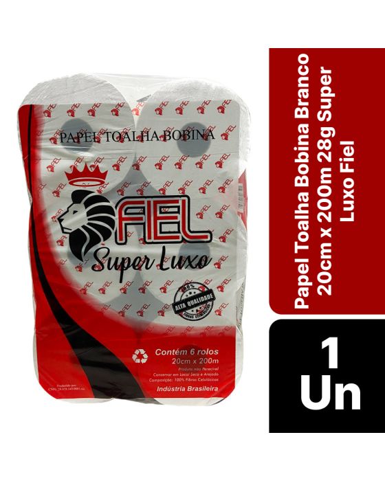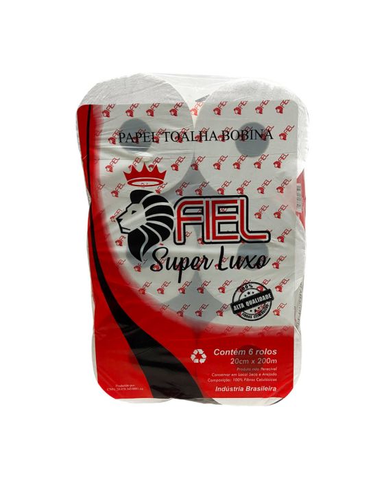 Características:O Papel Toalha Bobina Super Luxo Fiel oferece suavidade e resistência na hora de secar as mãos, e ainda rende muito mais, sendo ideal para ambientes de alto fluxo!Detalhes:- Marca: Fiel;- Modelo: Super Luxo;- Linha: Papel Toalha;- Tipo: Bonina Auto Corte;- Cor: Branco;- Quantidade de rolos: 6 rolos;- Contém: 1 embalagem com 6 unidades do produto;- Tamanho: 20cm x 200m;- Gramatura: 28g;- Alta Qualidade;- 100% Fibras celulósicas;- Produto não perecível.Indústria Brasileira. | Validade: Indeterminada.Ideal para:- Ideal para banheiros, vestiários, cozinhas e demais ambientes.Conservação:- Conservar em local seco e arejado.Composição:- Fabricado em 100% Fibras celulósicas.Medidas:- Dimensões do rolo: 17 x 17 x 20cm (CxLxA);- Dimensões da embalagem: 51 x 34 x 20cm (CxLxA);- Peso: 6,2kg.* As especificações podem ser alteradas sem aviso prévio ** Imagem meramente ilustrativa.