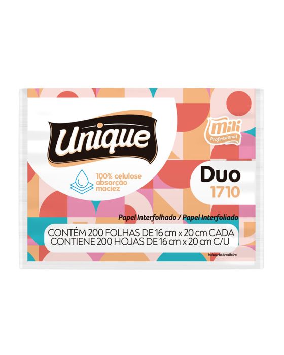 Características:O Papel Toalha Interfolhado Branco Duo Mili Professional te garante maior absorção e maciez, além de ser fabricado em 100% celulose o que garante maior conforto e qualidade! Para permitir que você leve e deixe em uma mesa ou até mesmo na bolsa, possui picote para que quando você precisar basta puxar e sairá uma folha de papel toalha.Detalhes:- Marca: Unique;- Fabricante: Mili Professional;- Modelo: Duo;- Referência: 1710;- Linha: Papel Toalha;- Tipo: Interfolhado;- Cor: Branco;- Quantidade: 200 folhas;- Tamanho: 16m x 20cm;- Contém: 1 embalagem com 200 folhas;- Gramatura: Aproximadamente 15,5 g/m2;- Produto não perecível;- Ideal para mesa;- 100% Celulose;- Super Absorção;- Absorvência e Maciez.Indústria Brasileira. | Validade: Indeterminado.Especificações técnicas:- Gramatura (gr/m²): 13,5 ~ 15,5 gr/m²;- Alvura (%): Mínimo 80.Composição:- Fabricado em 100% celulose.Armazenamento:- Não armazenar em ambientes com umidade e que contenha odores;- Armazenamento na embalagem original.Medidas:- Dimensões da unidade (folha): 16cm x 20cm;- Dimensões da embalagem: 16 x 10,5 x 12cm (CxLxA);- Peso: 185,6g.* As especificações podem ser alteradas sem aviso prévio** Imagem meramente ilustrativa.