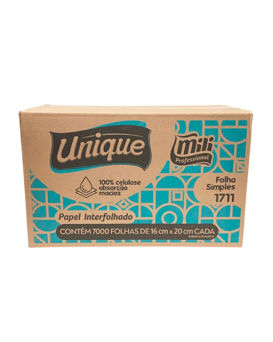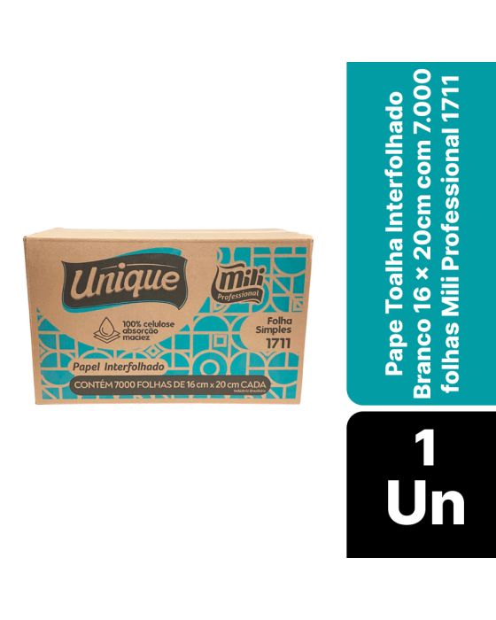 Características:- Eficiência e qualidade para ambientes profissionais: O Papel Toalha Interfolhado Branco Mili Professional 1711 (16 x 20cm | 7.000 folhas) foi desenvolvido para atender às exigências de higiene e praticidade em ambientes corporativos, comerciais e institucionais. Fabricado com 100% celulose virgem, o produto oferece toque macio, alta capacidade de absorção e resistência ideal para uso em dispensers de toalhas interfolhadas, garantindo secagem eficiente e controle de consumo.- Alta absorção e conforto ao toque: Com gramatura de 17g, o Papel Toalha Mili Professional assegura equilíbrio entre maciez e desempenho, proporcionando secagem eficaz sem desintegrar facilmente durante o uso. Seu formato interfolhado facilita a retirada de uma folha por vez, promovendo economia e evitando o desperdício. A tonalidade branca reforça a sensação de limpeza e cuidado, sendo ideal para locais com alto padrão de higiene, como banheiros corporativos, clínicas, restaurantes e escritórios.- Desempenho profissional com economia e praticidade: Com 7.000 folhas de 16 x 20cm cada, o papel é embalado em um volume otimizado para reabastecimento frequente, tornando-se uma opção econômica e funcional para empresas que buscam alto rendimento e qualidade constante. O material é compatível com diversos modelos de dispensers, permitindo fácil adaptação aos sistemas já instalados.- Armazenamento e conservação: Para preservar a integridade e a qualidade do papel, recomenda-se armazenar o produto em local seco, arejado e protegido da umidade, evitando o contato direto com superfícies úmidas.- Marca referência em higiene e cuidado: A linha Mili Professional foi especialmente desenvolvida para atender ambientes de uso coletivo, unindo praticidade, resistência e economia.- Dimensões do produto: Comprimento: 53,5cm; Largura: 26cm; Altura: 34cm; Peso: 4,255kg.* As especificações podem ser alteradas sem aviso prévio ** Imagem meramente ilustrativa.