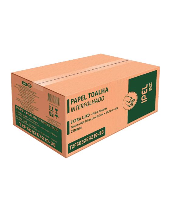 Características:O Papel Toalha Interfolhado Folha Simples Ipel é um papel de alto padrão de qualidade. Proporciona um bom custo x beneficio no uso final do produto.Detalhes:- Marca: Ipel;- Modelo: Basic;- Referência: T2F2032E3219-35;- Linha: Papel Toalha Interfolhado;- Tipo: Extra Luxo;- Folha: Simples;- Cor: Branco;- Contém: Caixa com 2.000 folhas;- Medidas: 19,3cm x 20,5cm;- Gramatura: 19g;- Quantidade de dobras: 2 dobras;- 100% fibras de celulósicas.Indústria Brasileira. | Validade: Indeterminada.Ideal para:- Industrias, restaurantes, empresas e comercio em geral, escolas, Faculdades, órgãos públicos, instituição privada, clinicas medicas e odontológicas, laboratórios, Hospitais, instituições religiosas, etc.Conservação:- Armazenar em lugar seco e arejado.- Produto não perecível.Composição:- 100% Fibras celulósicas.Medidas:- Dimensões da embalagem: 44,2 x 21,5 x 20,3cm (CxLxA);- Peso: 2,881kg.* As especificações podem ser alteradas sem aviso prévio. ** Imagem meramente ilustrativa.