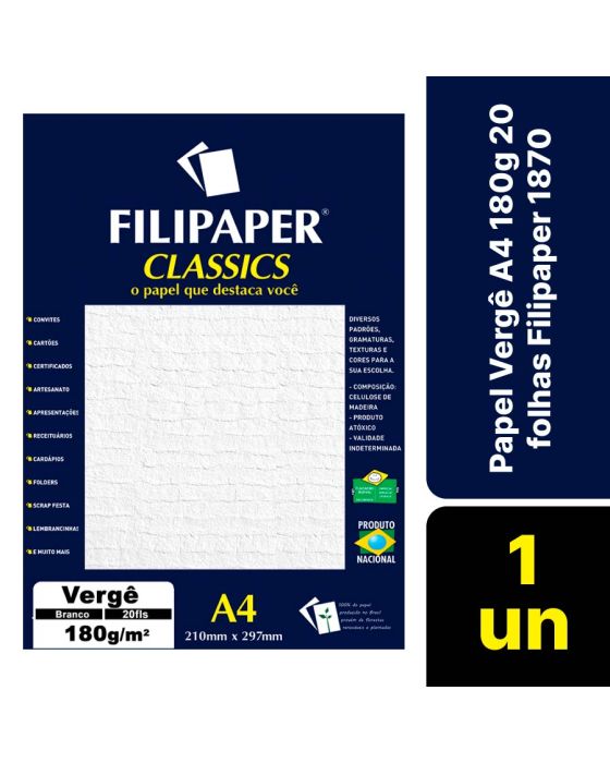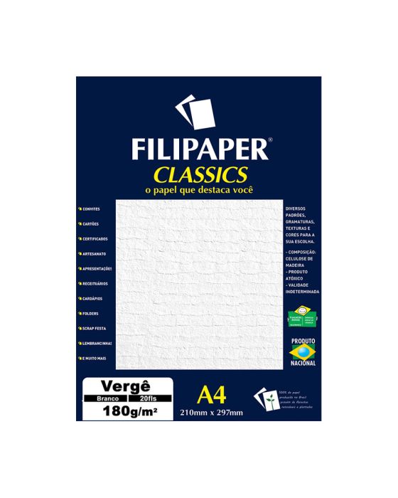Características:- Pacote com 20 folhas – textura clássica com marca d’água para impressos sofisticados e elegantes: O Papel Especial Filipaper Vergê Branco é ideal para aplicações que exigem um toque tradicional e refinado. Sua superfície apresenta marca d’água que simula o papel artesanal antigo, inspirado na técnica oriental de produção em telas de bambu entrelaçadas com fios de seda, conferindo aparência distinta e valorizada.- Desempenho técnico e durabilidade: Com gramatura de 180g/m², o papel oferece estrutura firme, excelente planicidade e desempenho superior em processos gráficos. Sua composição alcalina, livre de ácido, evita o amarelamento ao longo do tempo, mantendo a integridade do impresso por muitos anos. Apresenta ótima absorção de tinta e excelente comportamento em técnicas como off-set, silk screen, tipografia, relevo seco, relevo americano, hot-stamping, além de ser compatível com acabamentos de laminação e corte e vinco.- Sustentabilidade e composição nobre: Produzido com 100% de fibras de eucalipto provenientes de florestas plantadas e renováveis, o papel Vergê alia tradição e responsabilidade ambiental. Sua formulação segue critérios sustentáveis e assegura alto padrão de qualidade e durabilidade, sendo uma escolha consciente para projetos gráficos sofisticados. Produto 100% nacional.- Aplicações ideais: Recomendado para convites, certificados, cartões, folders, cardápios, receituários, apresentações corporativas, lembranças, scrap festas e projetos artesanais. O acabamento com marca d’água reforça a elegância e autenticidade do material impresso.- Fabricante: A Filipaper é reconhecida no mercado brasileiro por sua linha de papéis especiais voltados para o segmento gráfico, criativo e institucional.- Dimensões do produto:Comprimento: 30cm;Largura: 21,5cm;Altura: 0,7cm;Peso: 275g.* As especificações podem ser alteradas sem aviso prévio ** Imagem meramente ilustrativa.