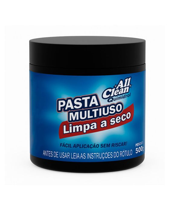 Características:- Eficiência e versatilidade na limpeza em um só produto: A Pasta Multiuso Limpa a Seco All Clean 500g foi desenvolvida para proporcionar limpeza profunda e brilho imediato em diferentes tipos de superfícies, sem necessidade de enxágue. Sua fórmula potente remove sujeiras com facilidade e preserva o acabamento original, oferecendo praticidade e alto rendimento no uso diário.- Desempenho e tecnologia de limpeza: Com ação desengordurante e alto poder de remoção de resíduos, a Pasta All Clean atua eficazmente em superfícies como plásticos, couros, mármores, eletrodomésticos, fogões, refrigeradores, bancadas, vidros, carpetes, metais cromados, móveis laqueados e calçados. Sua aplicação a seco evita o uso excessivo de água e garante resultado rápido e uniforme.- Fácil aplicação e acabamento perfeito: O produto é simples de usar e não risca as superfícies. Basta umedecer a esponja com a pasta, aplicar em movimentos circulares e finalizar com um pano seco para restaurar o brilho. Quando usada em vidros, também atua como antiembaçante, garantindo mais visibilidade e proteção contra acúmulo de umidade.- Composição e formulação eficiente: A fórmula contém tensoativo aniônico, espessante, coadjuvante, sequestrante, essência, amoníaco, glicerina e água, resultando em uma combinação eficaz para dissolver sujeiras, remover manchas e deixar um agradável perfume após a limpeza.- Aplicações e uso indicado: Indicada para uso doméstico e profissional, a Pasta Multiuso Limpa a Seco All Clean é ideal para quem busca um único produto para diversas finalidades, otimizando tempo e garantindo limpeza completa em diferentes ambientes e superfícies.- Sobre a marca All Clean: A All Clean é reconhecida por desenvolver produtos de alta performance voltados à limpeza prática e eficiente, unindo tecnologia e qualidade para atender tanto o uso residencial quanto o profissional, sempre com foco em rendimento, segurança e resultados superiores.- Dimensões da embalagem:Comprimento: 9,2cm; Largura: 9,2cm;Altura: 10,3cm;Peso: 1,09kg.IMPORTANTE! CONSERVAR FORA DO ALCANCE DAS CRIANÇAS E DOS ANIMAIS DOMÉSTICOS.* As especificações podem ser alteradas sem aviso prévio ** Imagem meramente ilustrativa.
