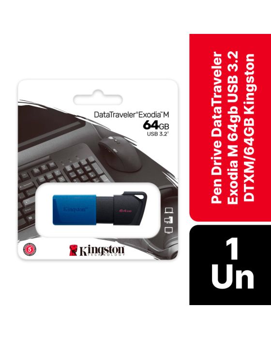 Características:O DT Exodia M permite transferências rápidas e armazenamento conveniente de documentos, músicas, vídeos e muito mais. Está disponível em várias opções de cores elegantes que correspondem à capacidade até 256GB. Seu design prático o torna uma solução de armazenamento ideal em movimento, seja no trabalho, em casa ou na escola. O DT Exodia M tem uma garantia de cinco anos, suporte técnico gratuito e a lendária confiabilidade Kingston®.Detalhes:- Marca: Kingston;- Modelo: DataTraveler Exodia Onyx;- Referência: DTXM/64GB;- Linha: Pen Drives;- Cor: Preto;- Cor Capa: Azul Escuro;- Capacidade: 64gb;- Velocidade: Compatível com USB 3.2 Gen 1;- Contém: 1 unidade do produto;- Design: funcional: tampa móvel protege o conector USB e seus dados quando não estiver em uso;- Possui tampa móvel de proteção;- Conveniência ao seu alcance — A leveza da solução de armazenamento compatível com USB 3.2 Gen 1 oferece rápidas transferências de arquivos;- Portabilidade máxima: Gama de capacidades com tampa colorida e um laço que se prende facilmente aos porta-chaves.Compatibilidade:- Compatível com: Windows® 11, 10, 8.1, macOS (v.10.14.x +), Linux (v. 2.6.x +), Chrome OS™.Temperatura:- Temperatura de operação: 0°C~60°C;- Temperatura de armazenamento: -20°C~85°C.Medidas:- Dimensões do produto: 6,9 x 2,04 x 1,1Cm (CxLxAx); - Peso: 10g.Conteúdo da embalagem: 1 Pen Drive Datatraveler Exodia M 64GB USB 3.2 DTXM/64GB Kingston.Garantia do fornecedor: 5 anos contra defeitos de frabriçação.* As especificações podem ser alteradas sem aviso prévio ** Imagem meramente ilustrativa.