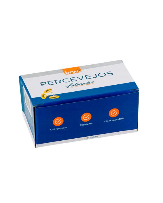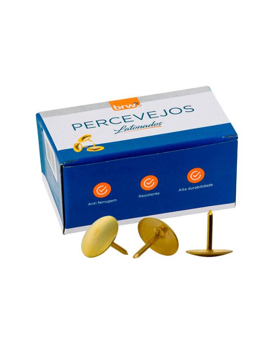 Caracteristicas:O Percevejo Latonado BRW é um item de excelente qualidade que garante resistência e praticidade para uso cotidiano.Detalhes:- Marca: BRW.- Modelo: PV0100.- Linha: Percevejos.- Cor: Dourado.- Contém: 1 caixa com 100 unidades.- Possui a cabeça redonda para facilitar a colocação.- Conta com ponta perfurante, por isso seu manuseio deve ser feito com cautela.- Anti ferrugem.- Resistente.- Alta durabilidade.Ideal para: - Ideais para fixar papéis, tecidos, faixas, fotos, calendários e para serem utilizados na tapeçaria, confecção de móveis e em artesanatos. Material:- Arame e chapa de aço com tratamento antiferrugem.* As especificações podem ser alteradas sem aviso prévio ** Imagem meramente ilustrativa